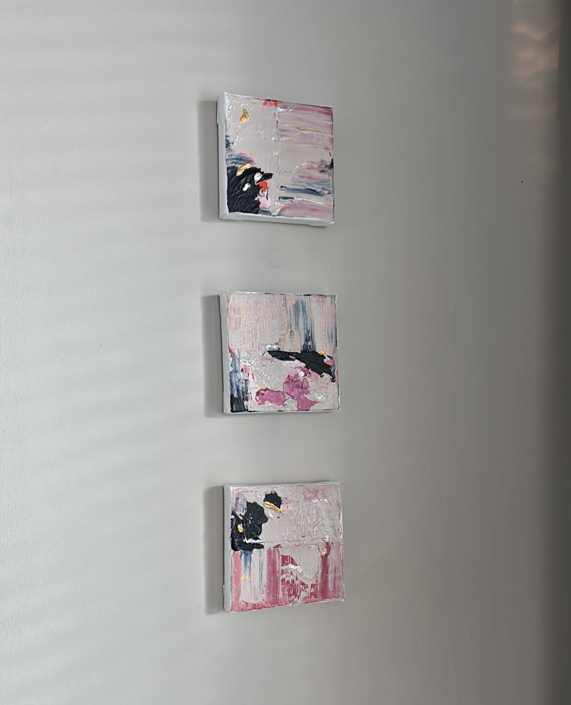 Kolme kappaletta akryyliteoksia puuhkehyksessä. Kunkin koko 10x10 cm. Voit ripustaa yhdessä tai erikseen.
