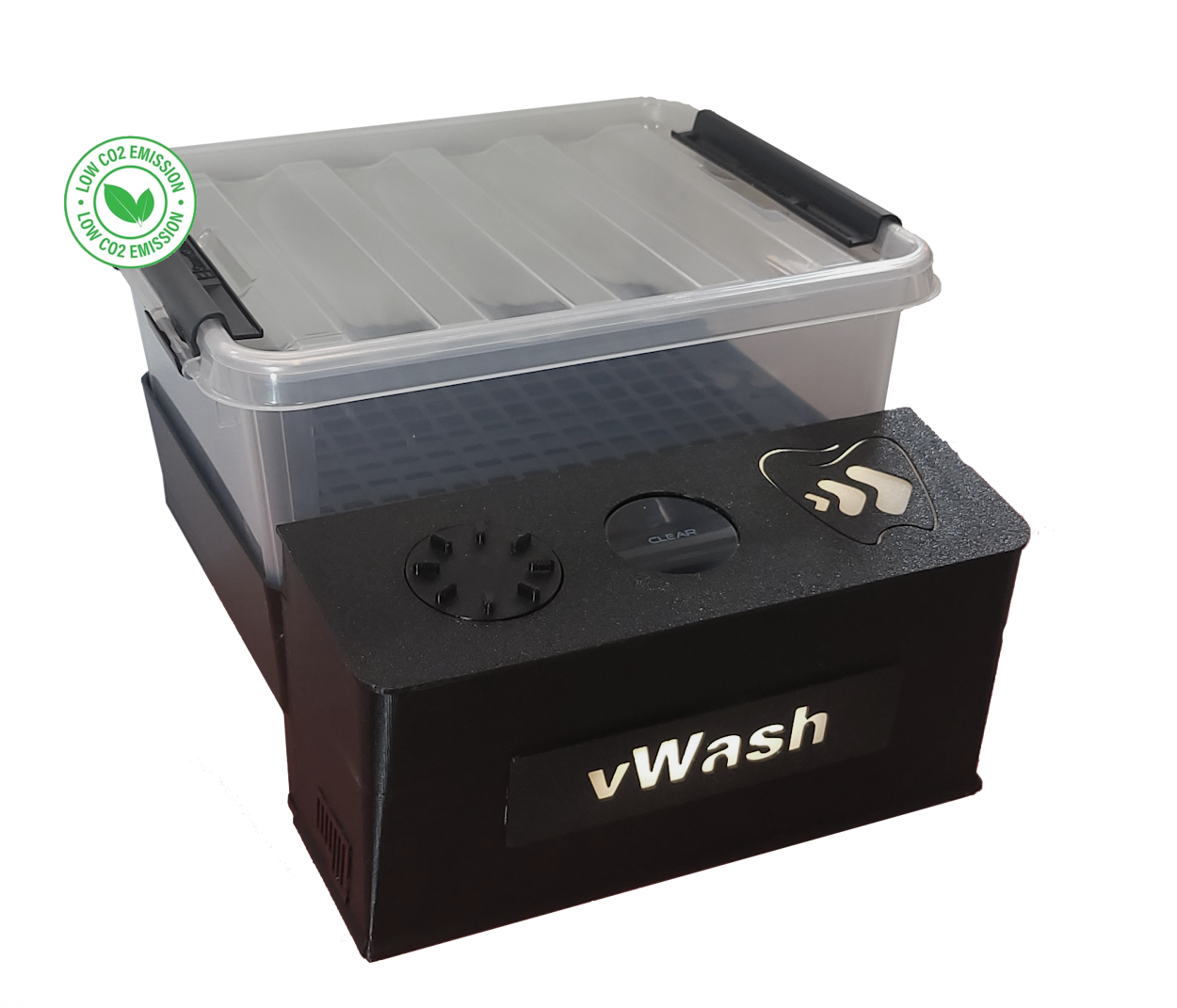 vWash is designed specifically for dentistry and laboratories, where precision, sterility, and cost-efficiency are essential. The device allows effective cleaning of small prints.