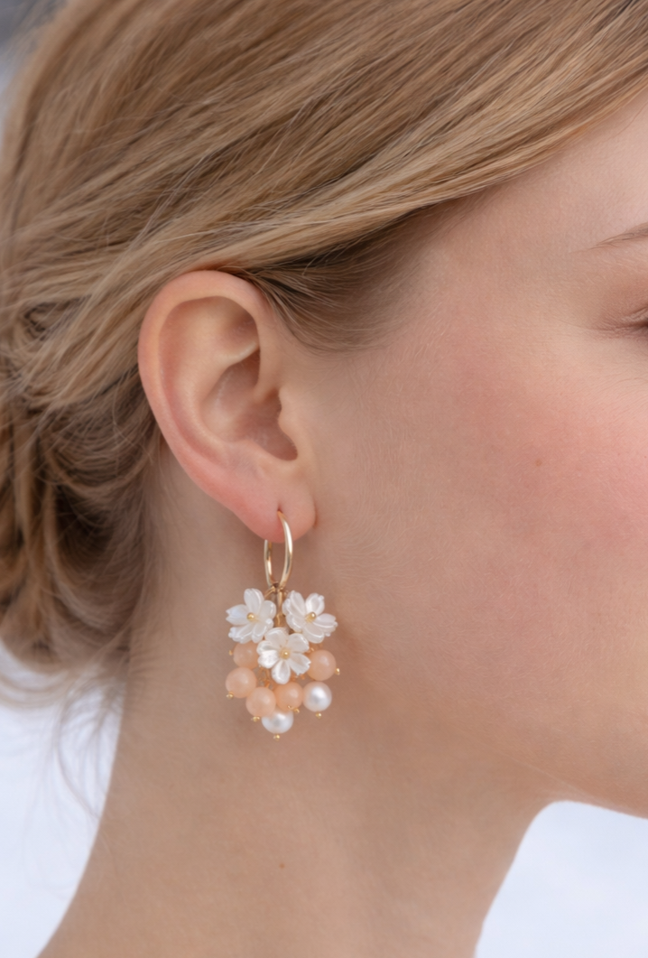 Viola kukka korvakorut on koottu ihanista lasihelmistä ja aidoista makeanveden helmistä. Valkoiset kukat ovat valkoista akryylia. Korvakorun renkaat ovat nikkeli vapaata kirurginterästä. Korujen pituus noin 3cm