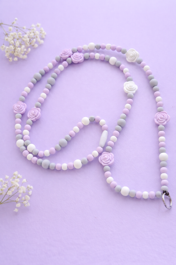 Kaunis ja kestävä yli olan menevä 130cm pitkä avainkaulanauha. Helmet ovat silikonihelmiä, jotka kestävät kulutusta ja ovat siksi pitkäikäiset. Avainnauhassa on käytetty paksua satiininyöriä, joka ei helposti katkea. Kaulanauhassa on myös takana muovinen turvalukko joka aukeaa kovassa kiskaisussa.