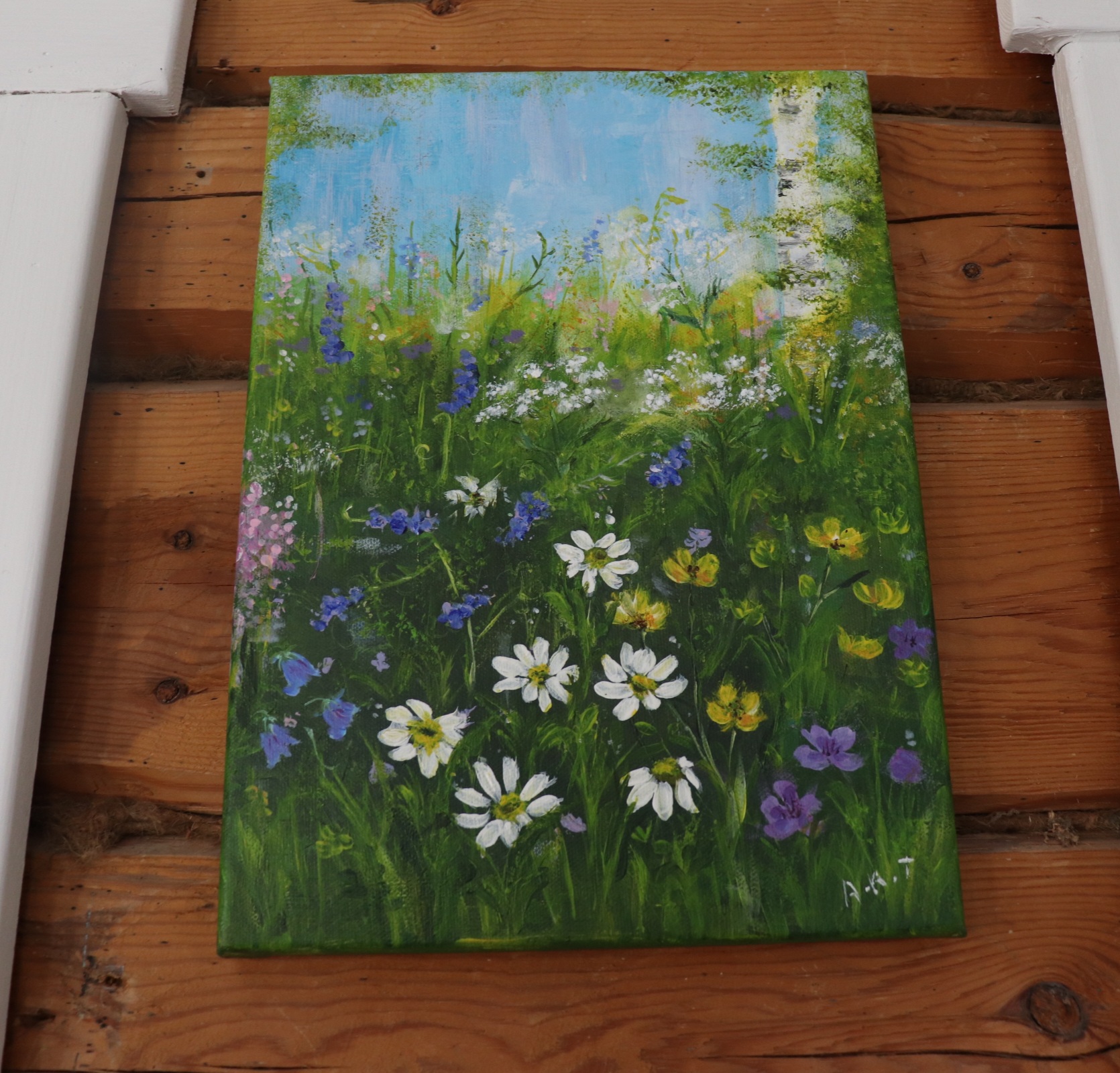 Tämä taulu sai inspiraation valokuvasta, jonka otin eräänä juhannuksena. Teosteni aiheet ja inspiraatio kumpuavat luonnon kauneudesta. Taulun koko on 33x24 cm. Teos on ripustusvalmis.