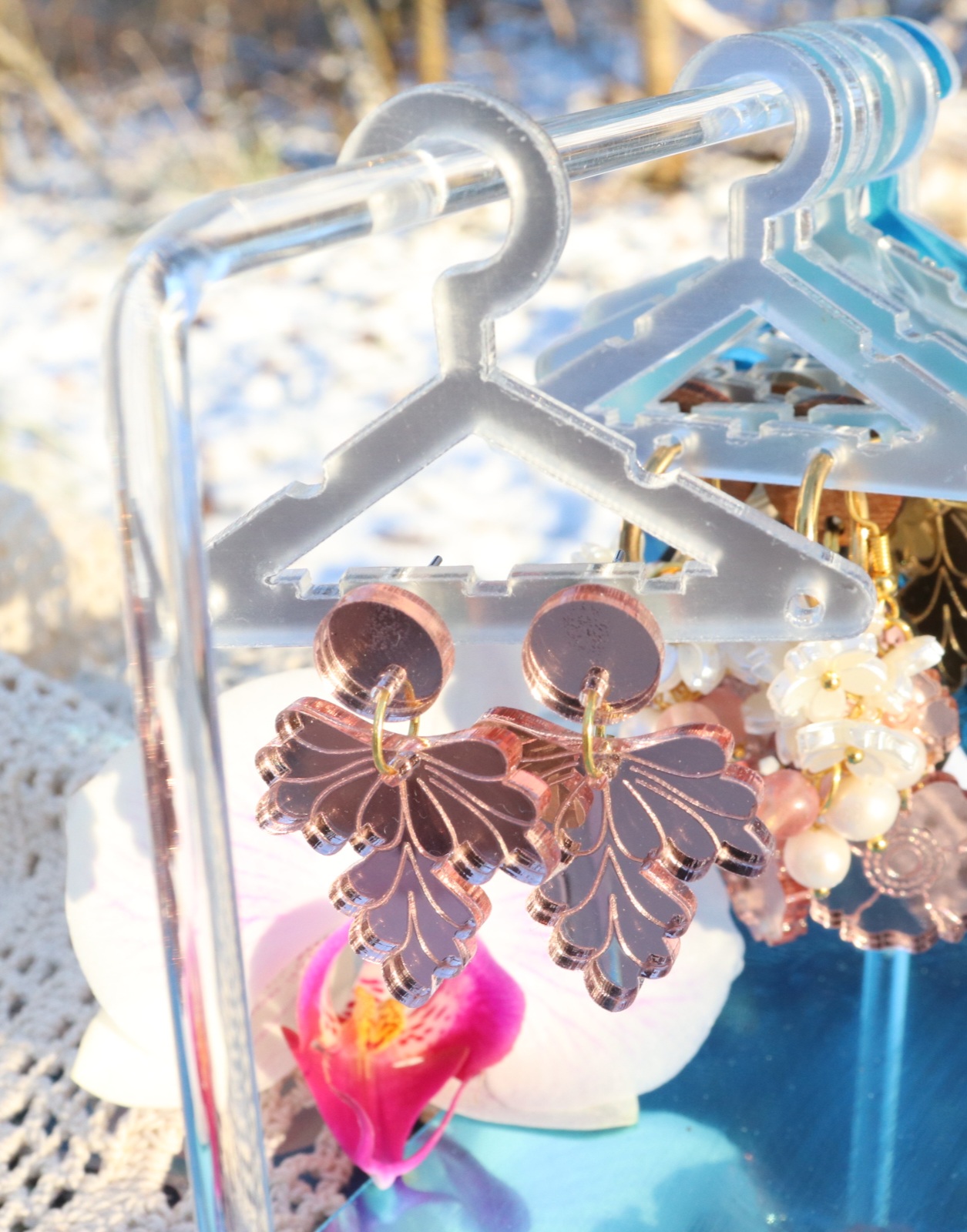 Lehdykkä korvakorut ovat valmistettu peiliakryylista, jonka pinta peilaa kauniisti. Korvakorut ovat nikkeli vapaata kirurginterästä. Korvakorut kiinnitetään tappi kiinnityksellä korvaan. Korujen pituus noin 2 cm.