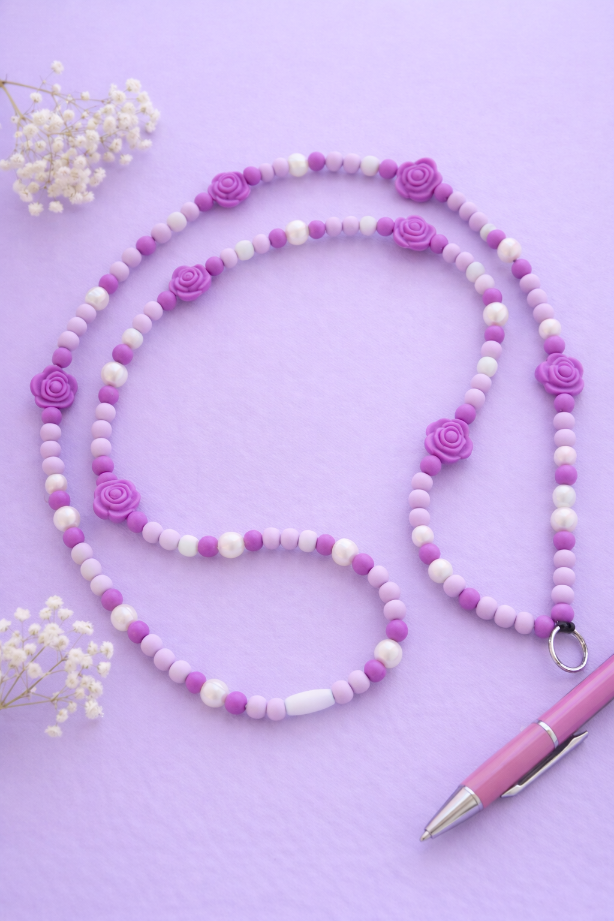 Kaunis ja kestävä yli olan menevä 130cm pitkä avainkaulanauha. Helmet ovat silikonihelmiä, jotka kestävät kulutusta ja ovat siksi pitkäikäiset. Avainnauhassa on käytetty paksua satiininyöriä, joka ei helposti katkea. Kaulanauhassa on myös takana muovinen turvalukko joka aukeaa kovassa kiskaisussa.