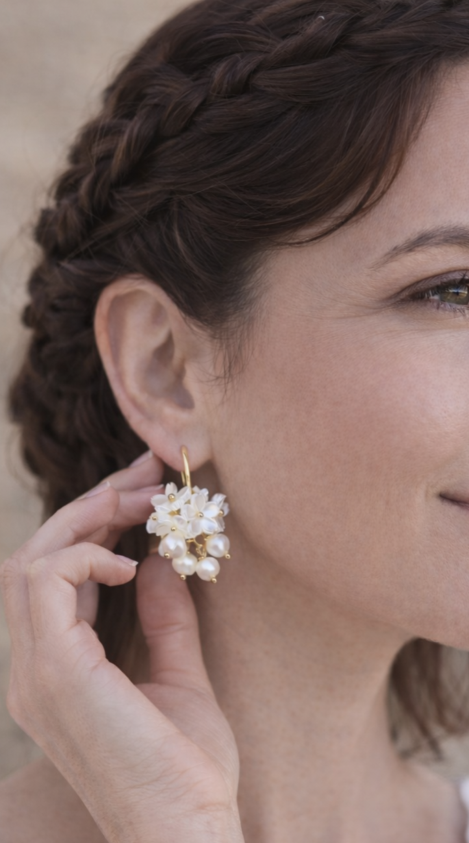 Viola kukka korvakorut on koottu ihanista aidoista makeanveden helmistä. Valkoiset kukat ovat valkoista akryylia. Korvakorun renkaat ovat nikkeli vapaata kirurginterästä. Korujen pituus noin 3cm