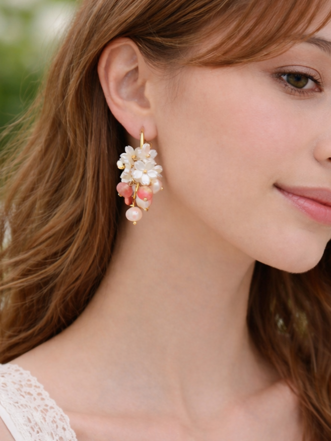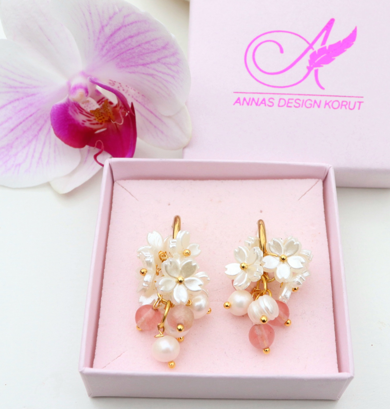 Viola kukka korvakorut on koottu ihanista roosan värisistä lasihelmistä sekä aidoista makeanveden helmistä. Valkoiset kukat ovat valkoista akryylia. Korvakorun renkaat ovat nikkeli vapaata kirurginterästä. Korujen pituus noin 3cm.