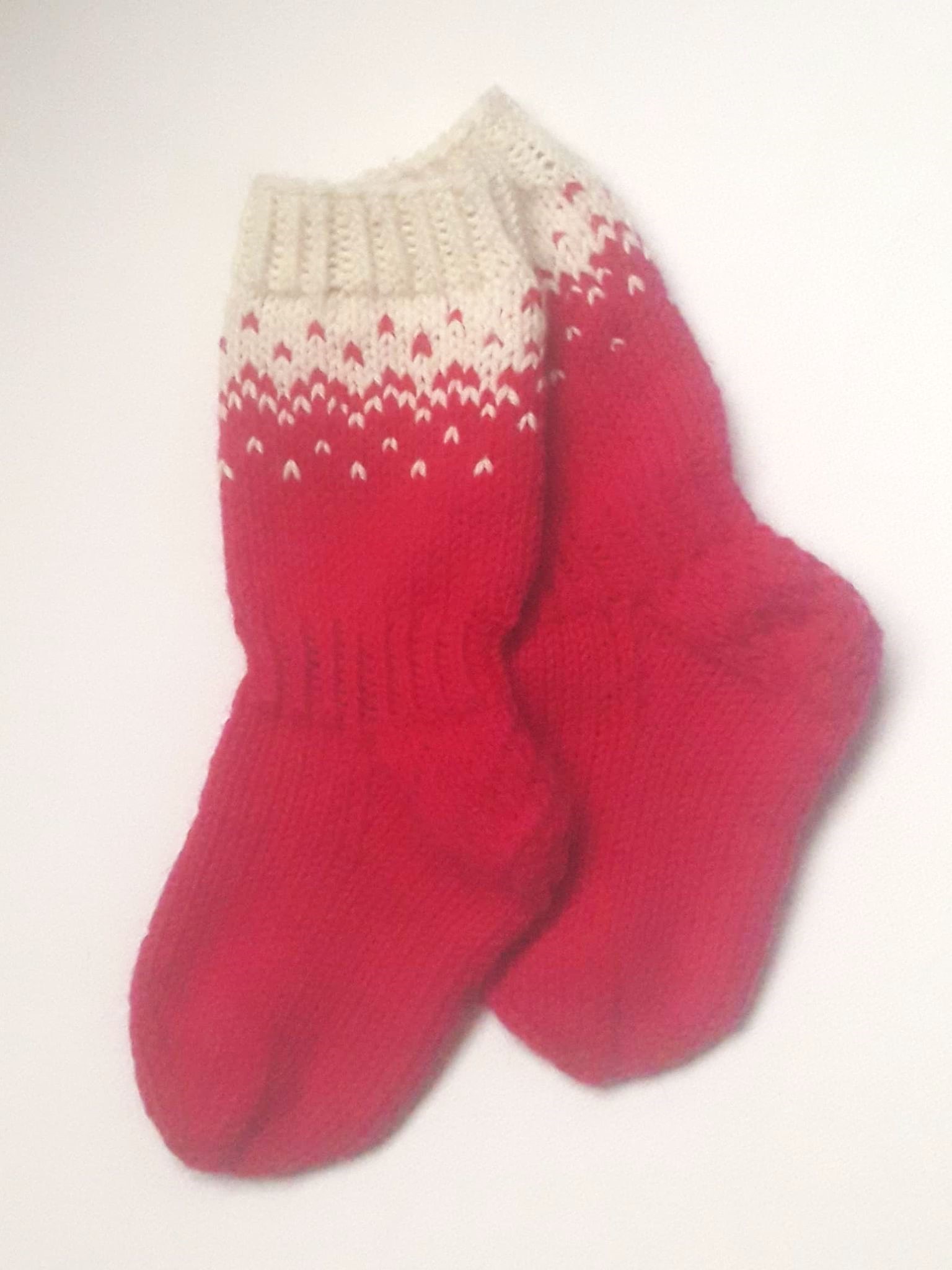 ✨ Käsinkudottu laadukkaasta langasta, villa 75%, polyamidi 25%. Konepesu 40. Lämpimät ja pehmeät pienille jaloille.