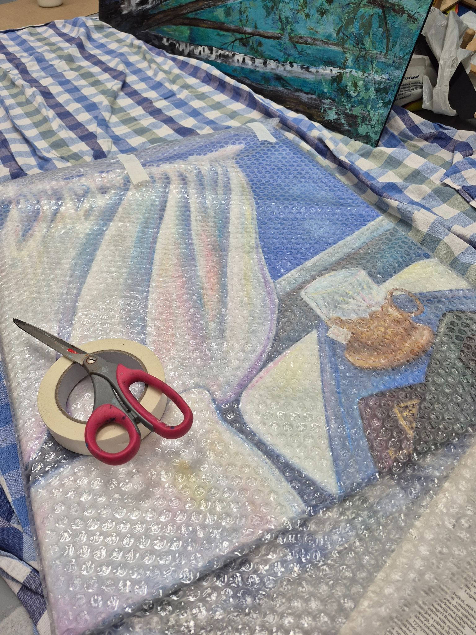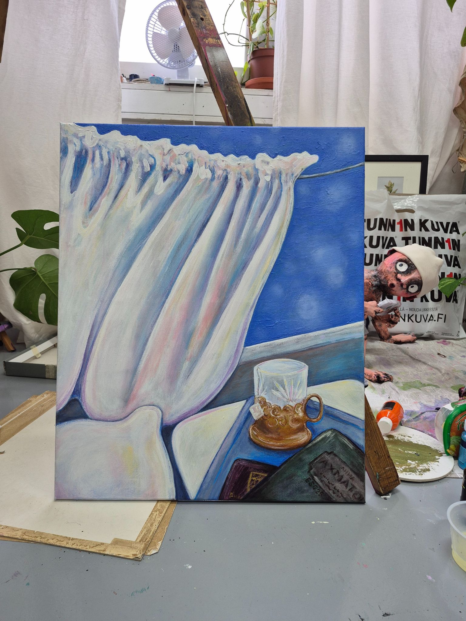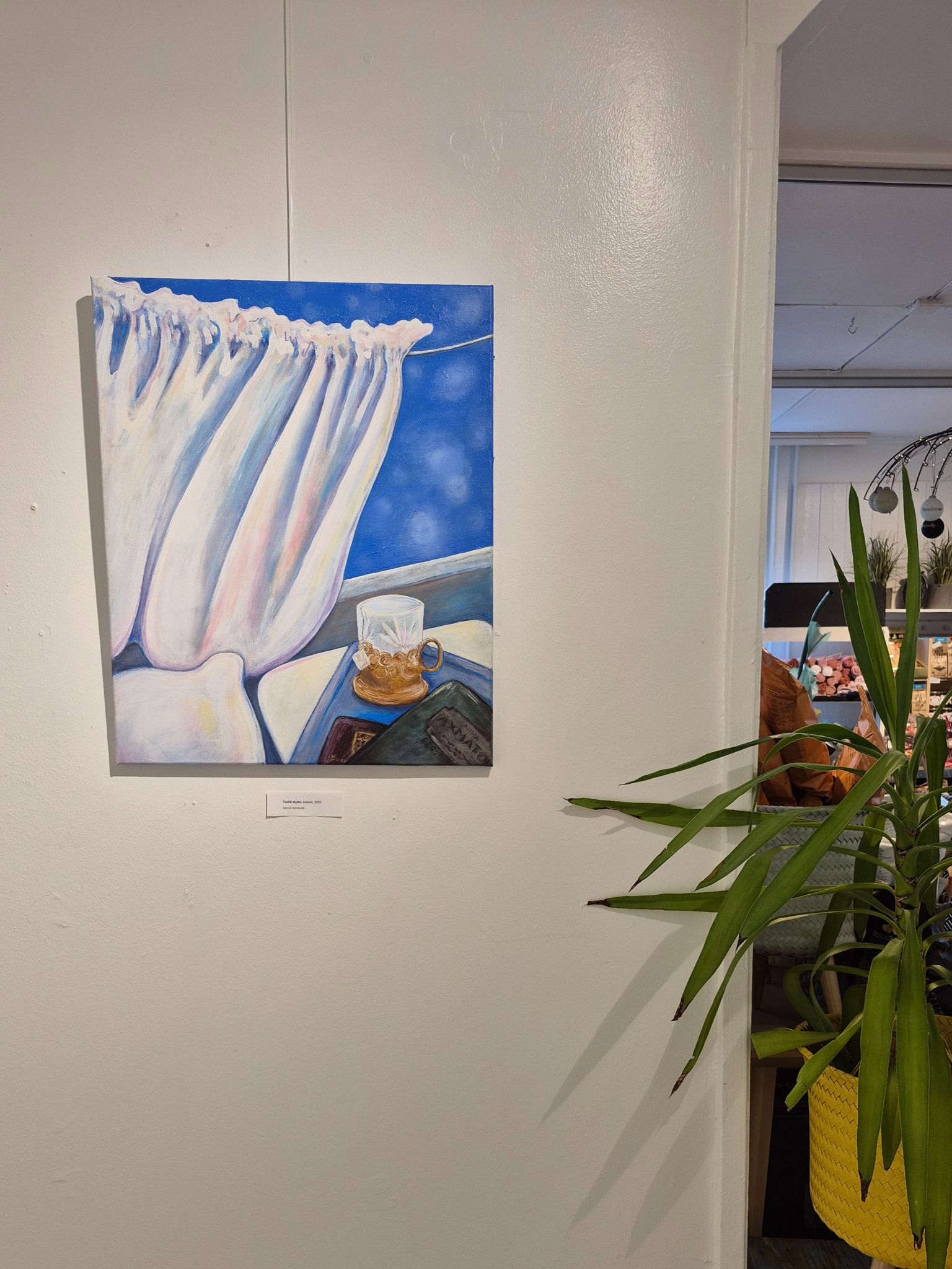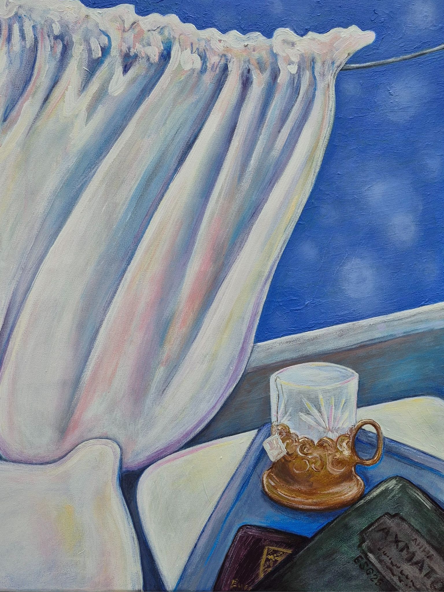 Teellä täytän sieluni (2025), akryyli canvaalle. Työ on osa omaelämänkerrallista kokonaisuutta, joka oli syyskuussa 2025 esillä Galleria Petitessä Helsingissä ensimmäisessä yksityisnäyttelyssäni nimeltä Хээр – Muistoja raiteilta ja Mongolian aroilta. Takana rautalankaripustus. Mitat 50x61cm. Kotimaan postimaksu sisältyy hintaan. Lähetetään Matkahuollon pakettina. Pääkaupunkiseudulla minun on mahdollista toimittaa teos myös itse, jolloin postimaksut voidaan vähentää hinnasta. Jos tahdot tulla katsomaan teosta työhuoneelleni Roihupellossa, ole yhteydessä sähköpostitse tai Instagramissa @elinasaarilahti.art.