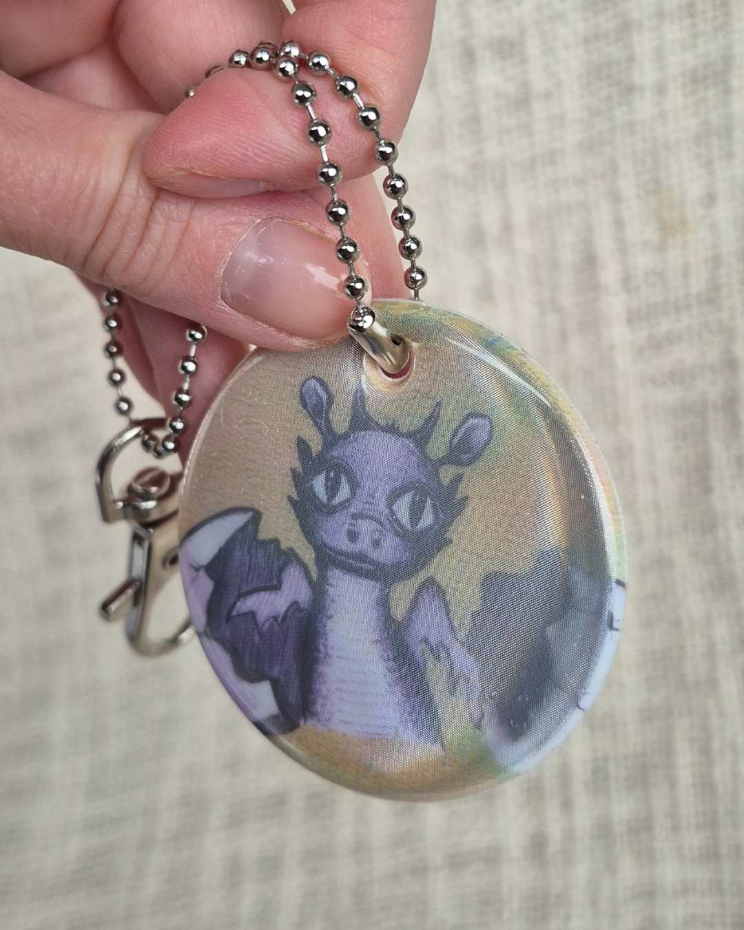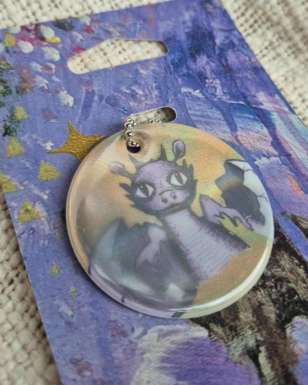 50mm pehmeä heijastin lohikäärmekuvituksellani. Sama kuva molemmilla puolilla. Heijastimissa on papukaijalukko ja palloketju. Heijastimet valmistaa Helsingissä Saintex vastuullisesti suomalaisista, vaatimukset täyttävistä heijastinmateriaaleista. Kaikissa heijastimissa taustana on ekopahville painettu bambikuvitus.