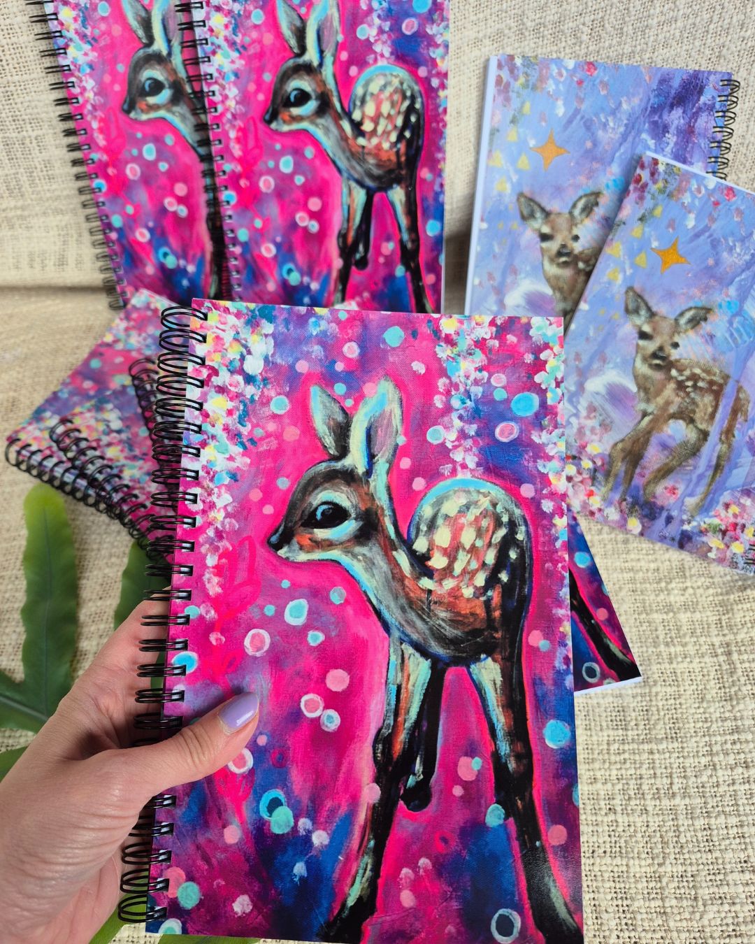 Kevyt, ohutkantinen luonnosvihko, ja jonka pinnoitettuja ulko- ja sisäkansia koristavat kuvat pinkistä ja liilasta bambimaalauksestani. Koko A5, 100 sivua, metallikierteet. Kaikki sivut ovat valkoisia. Kannen materiaali on kiiltävää ja valoa heijastavaa. Painettu Hollannissa. Mukana tulee bambikirjanmerkki.