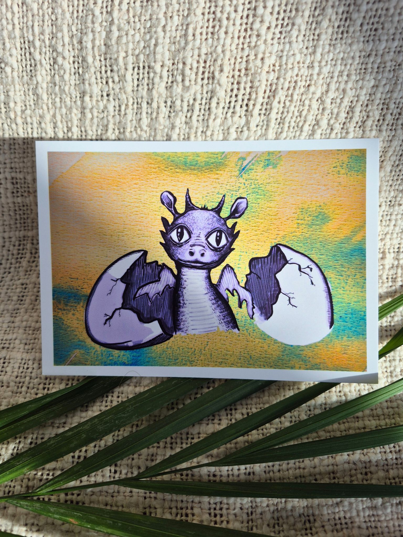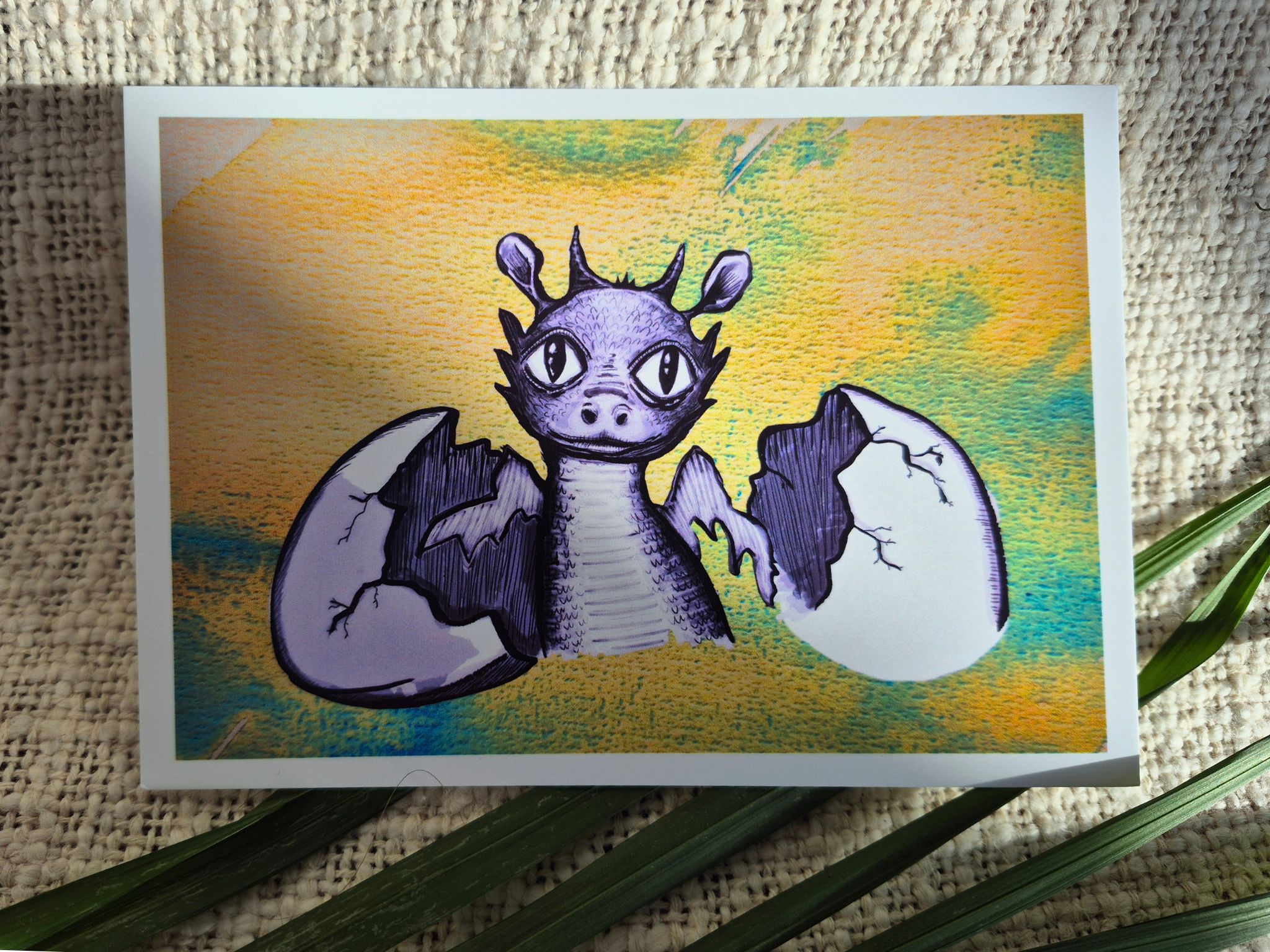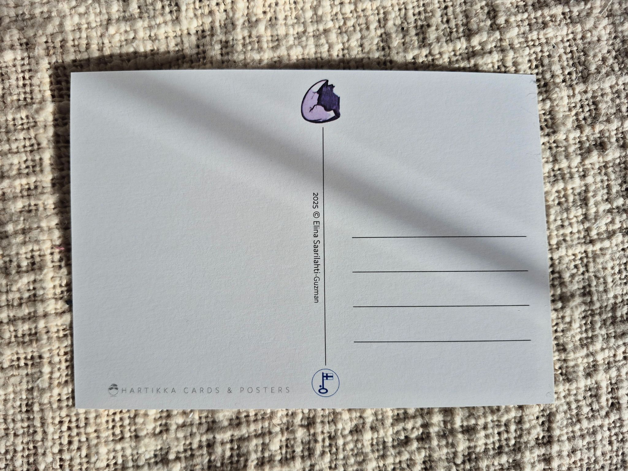 A6-kokoinen postikortti, jossa on sekatekniikalla toteutettu lohikäärmevauva. Kuvassa valkoiset marginaalit, kääntöpuolella osoiterivit. Painettu Suomessa. Postimaksu lisätään loppusummaan kassalla.