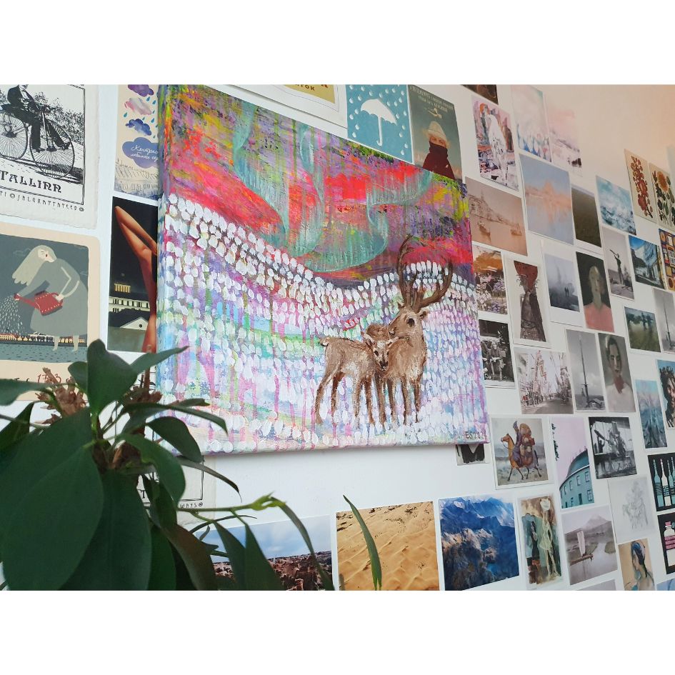 Maalaus, akryyli canvaalle. Maalaus jatkuu reunoille. Ripustusvalmis, takana rautalankakiinnitys. Koko 38x46x2cm. Maalattu Helsingissä. Hintaan lisätään postikuluja 7,50e, postituksen loppuhinta sisältyy hintaan. Lähetetään Matkahuollon pakettina. Jos tahdot postituksen sijaan mieluummin noutaa työn, olethan yhteydessä ennen ostotapahtumaa.