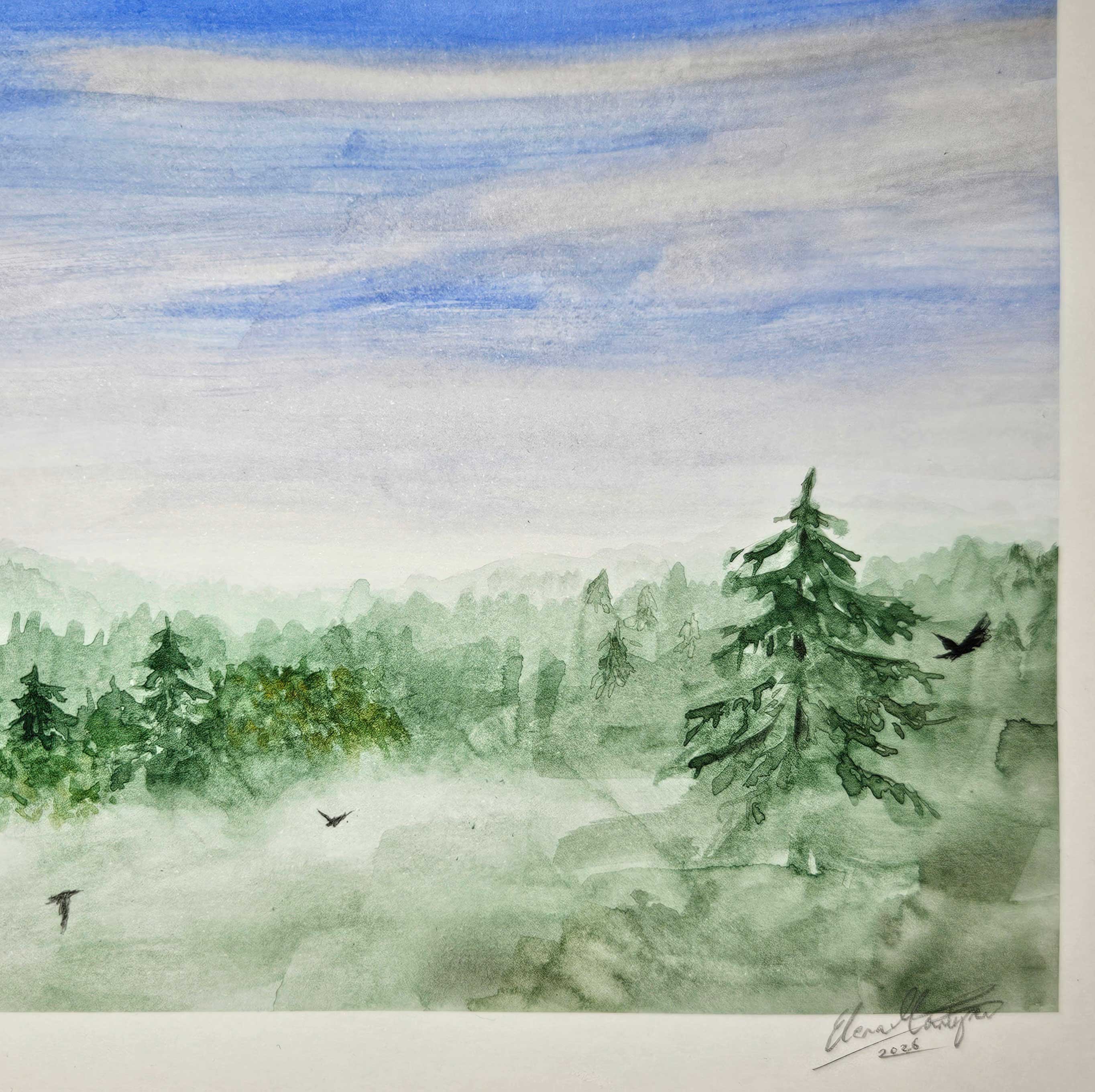 Vesiväri paperille (sileä) Mäntysen teos Kesäyön usva on rauhallinen kuvaus valoisasta yöstä metsien yllä. Utuinen usva peittää metsää ja vain korkeimmat puut ja mäet nousevat verhon yläpuolelle. Saatavilla Heimo-osuuskunnan verkkokaupassa!