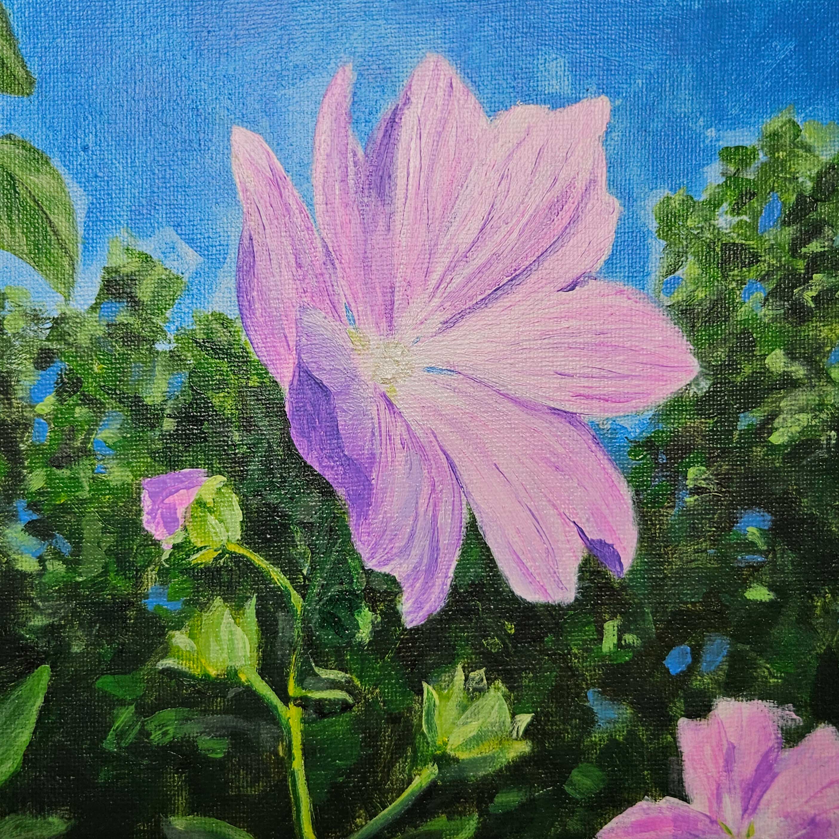 Akryyli kankaalle Malva oli mukana Elena Mäntysen näyttelyssä ”Kesää muistellen, kevättä kohti” vuonna 2025. Hempeän vaaleanpunainen malva nauttii auringosta ja vetää ehkä sinutkin mukaan kesäisiin haaveisiin. Saatavilla Heimo-osuuskunnan verkkokaupassa!