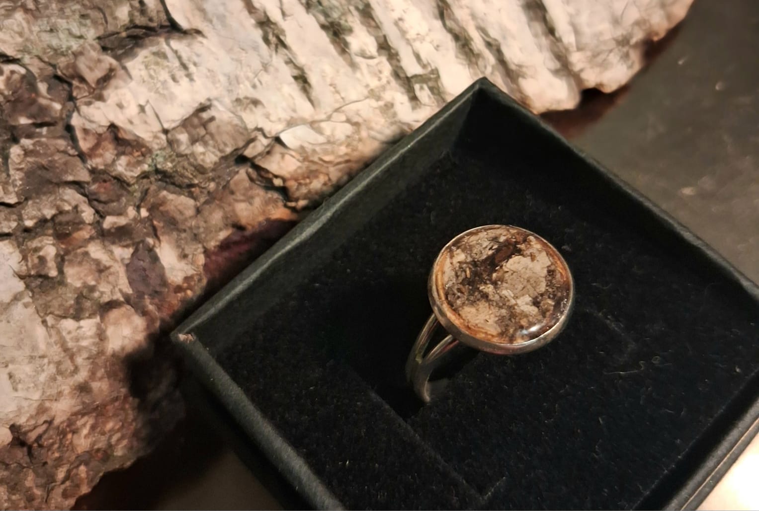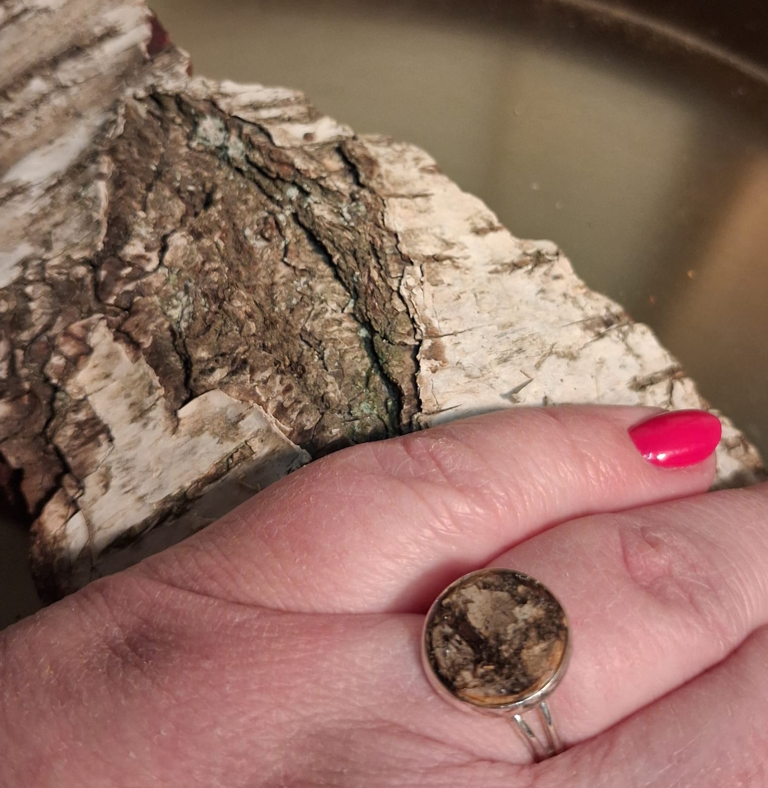 Koivu-sormuksessa on pala suomalaista koivua. Koruihin käytetty koivun tuohi on kerätty lähimetsästä, hakkuun jäljiltä maahan jääneistä tuohenpaloista.