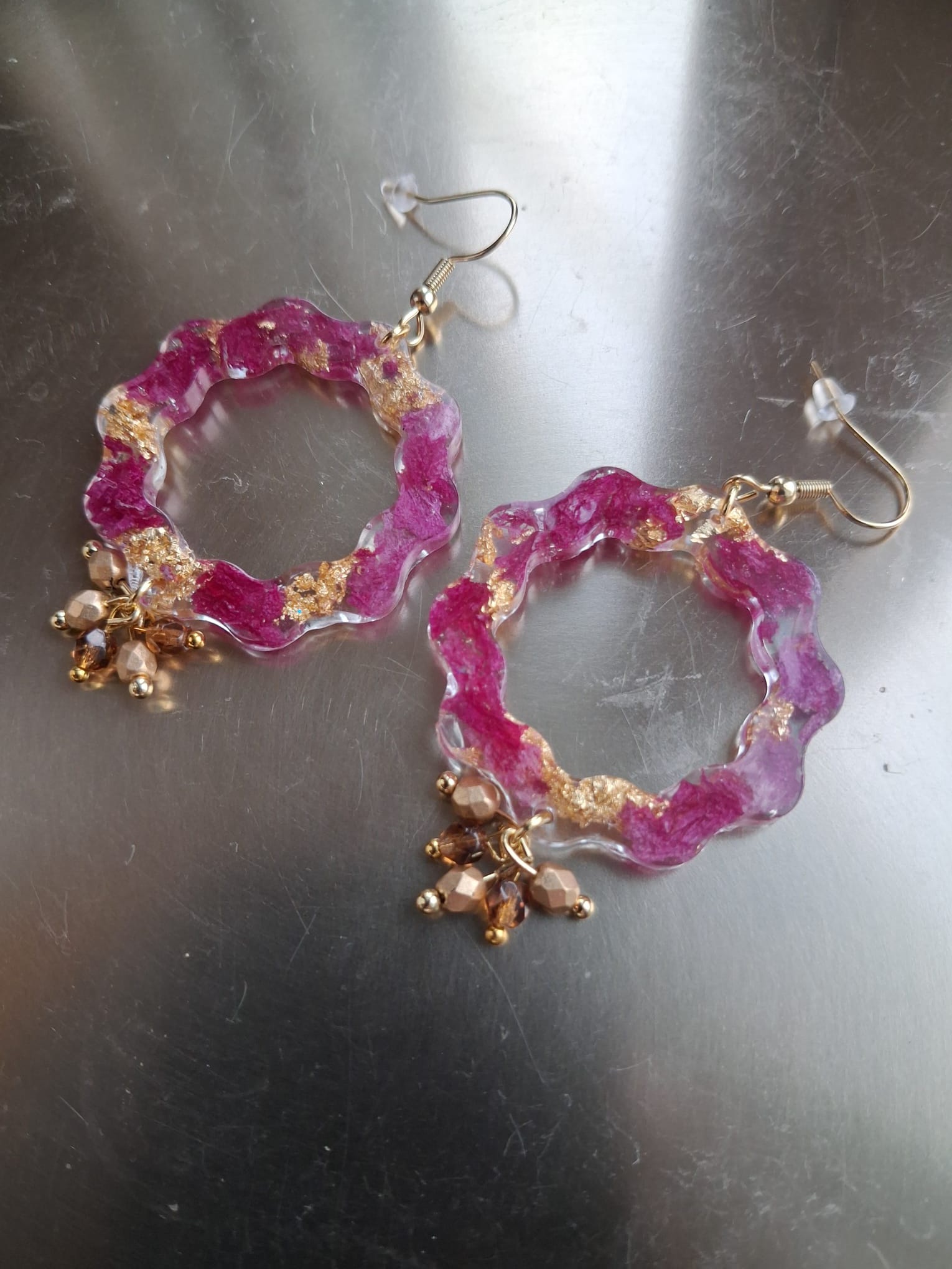 Pinkkiä pionia ja kultaa ♡ Lasihelmet. Kullanvärinen, nikkelitön koukkukiinnitys