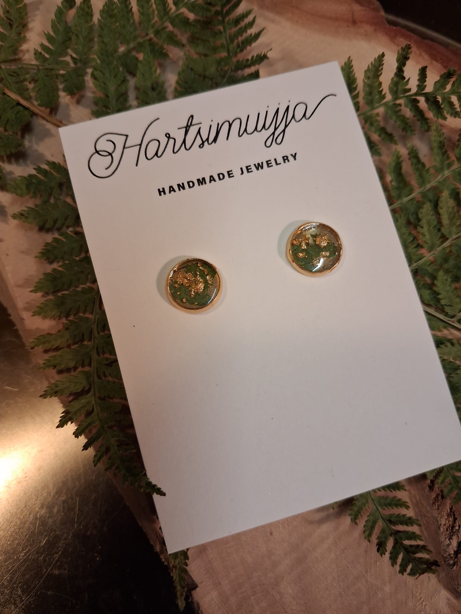 Saniaista ja kultaa, lyömätön yhdistelmä! Saniaiskorvikset hurmaa luonnollisella vihreydellään.