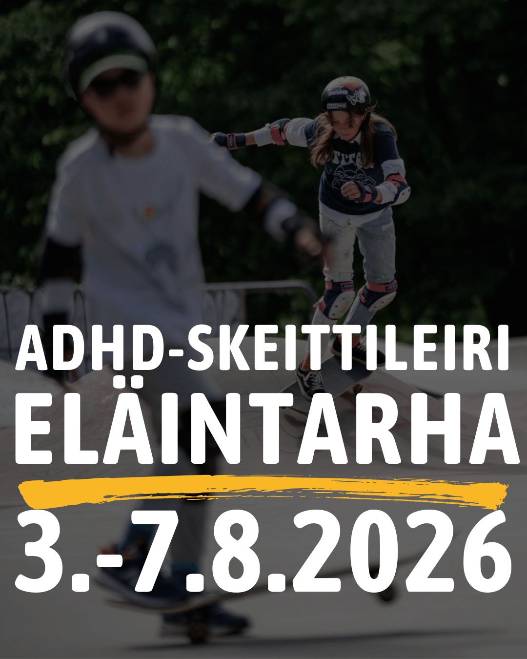 ADHD skeittileiri Eläintarhan skeittiparkilla 3.-7.8.2026! Leirillä ohjelmassa skeittaamista hyvällä porukalla, itsensä haastamista- ja ylittämistä. Leiri on suunnattu yli 10-vuotiaille, yläikärajaa ei ole. Liikumme leirillä paljon skeitaten paikasta toiseen, joten skeittauksen perusteet on hyvä olla hallussa.