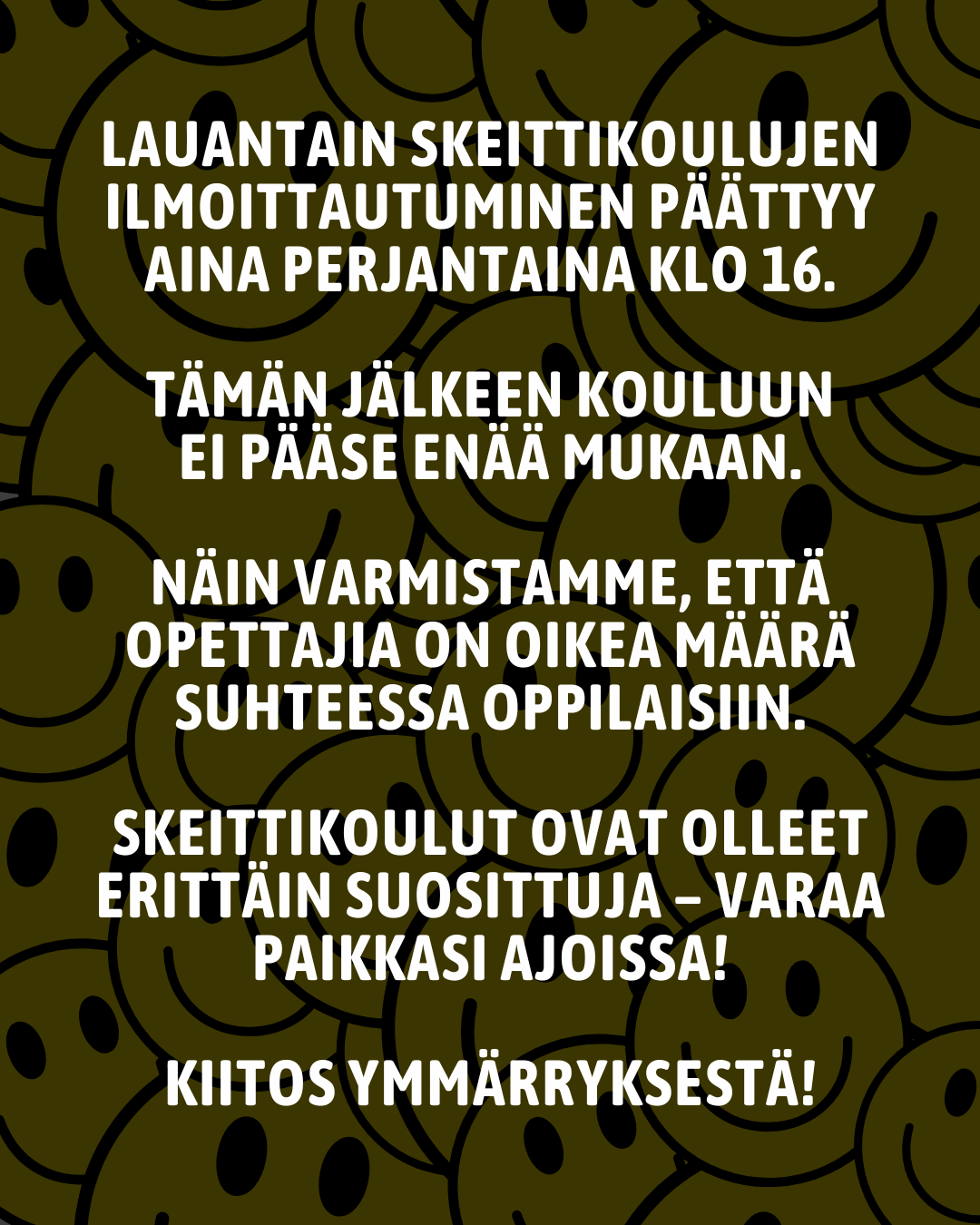 Lauantain skeittikoulujen ilmoittautuminen päättyy aina perjantaina klo 16.