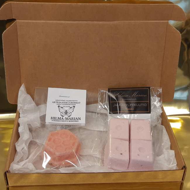 Huom! Lahjapakkaus voi olla myös rouhean rustiikkisen ruskea. Pinkki: Käsityönä kotimaassa valmistetut, raikkaan vadelman tuoksuiset jalkakylpykuutiot sellofaanipussissa, 4kpl/pss. Virkistävät ja raikastavat jalkojasi, kun laitat yhden tai kaksi kuutiota lämpimään veteen ja jalat sinne mukaan. Kylvetä jalkoja vartin verran piristävän tuoksuisessa jalkakylvyssä. Huuhtele ja kuivaa jalat lopuksi. Ainesosat: ruokasooda, sitruunahappo, epsomsuola, oliiviöljy, tuoksuöljy, CI 17200. Allergeenit: citral