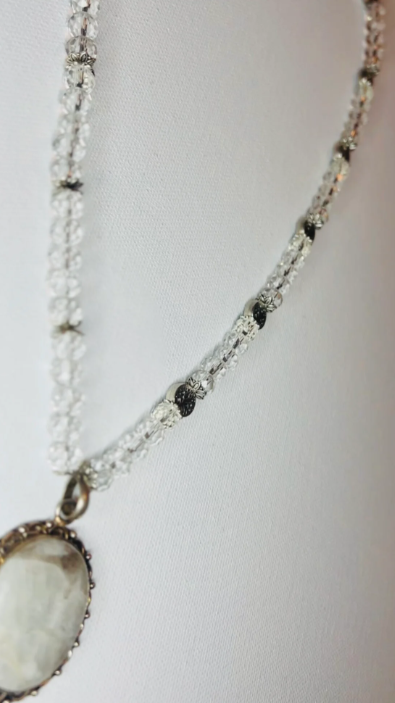 Stones: White agate & faceted white crystal Pattern: Flower spacer after every 5 crystals Pendant: White agate with Tree of Life charm Metal: Stainless steel / white metal Style: Handmade / one-of-a-kind Fit: Comfortable and lightweight for daily or occasional wear