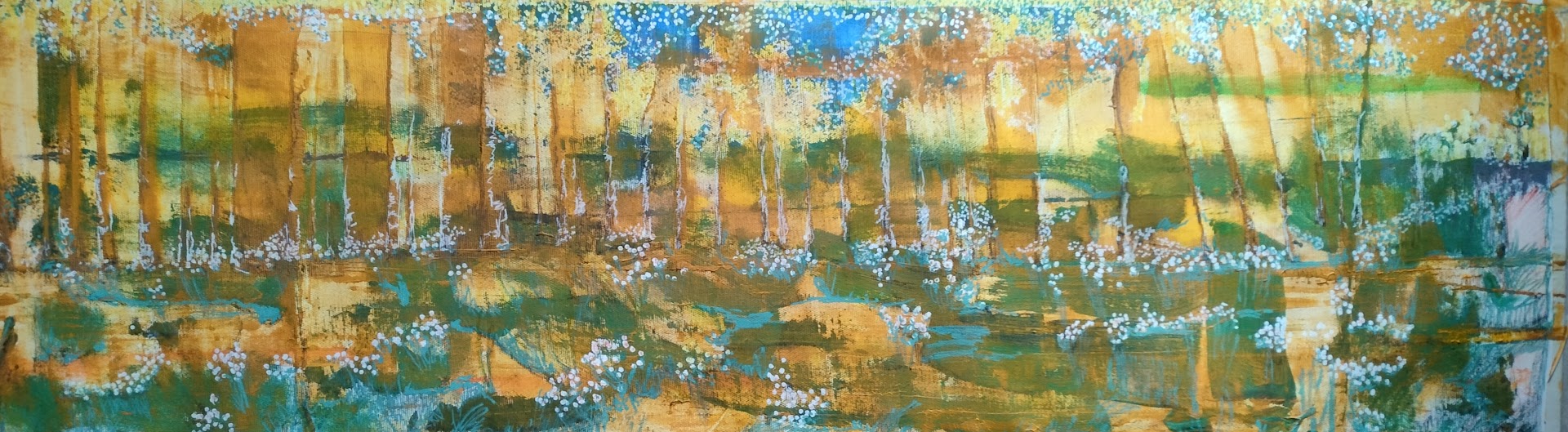 Kaukana poissa, sekatekniikkamaalaus kankaalle, 29 x 93 cm