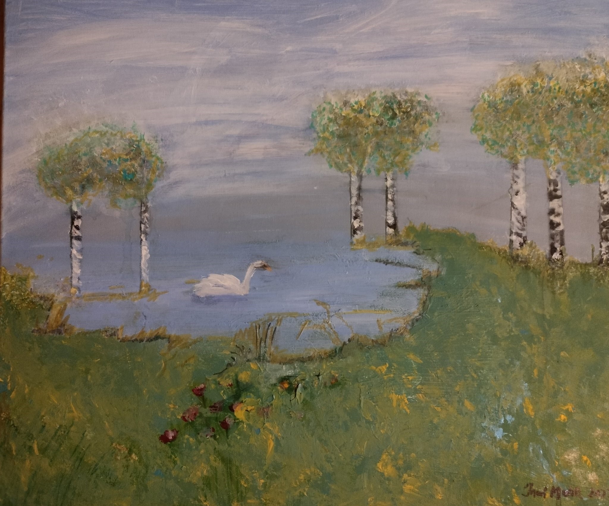Joutsen, 2025. Koko 50 x 60 cm, akryyli kankaalle. Maalattu myös reunat, ei siis välttämättä tarvitse kehystä. Rautalankaripustus.