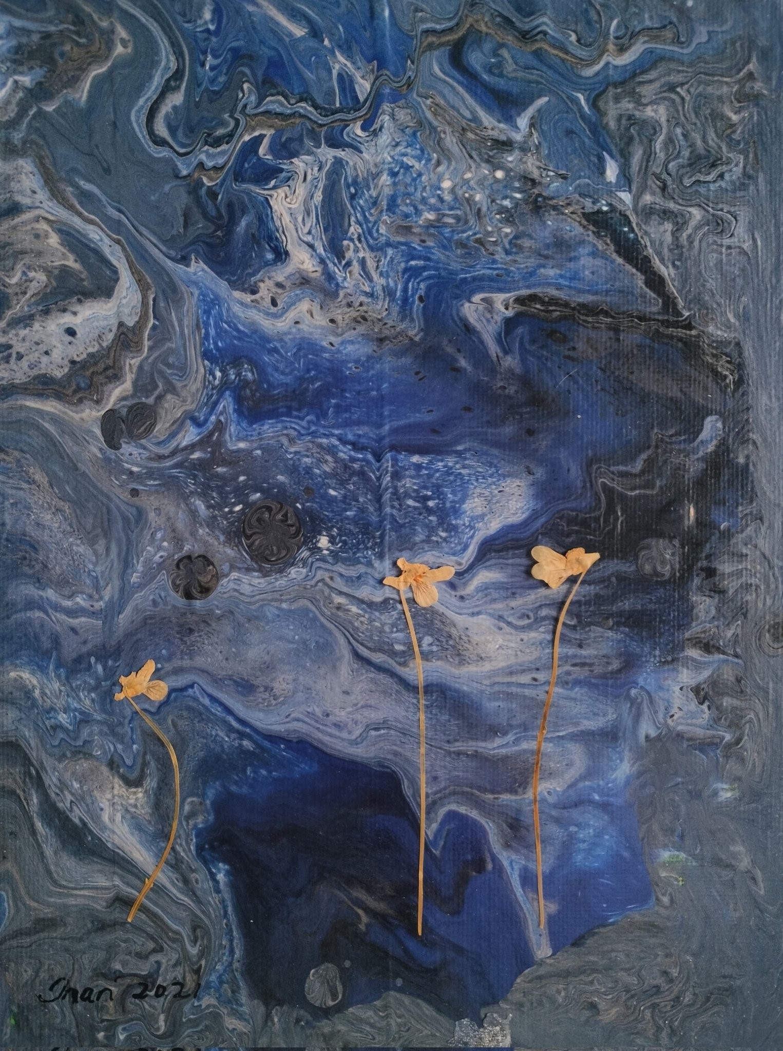Ymmärryksen merellä II, 2021. Mixed media, prässätyt kukat akryylipouringille. Canvaspohja, kehystetty valkealla kehyksellä, lasi. Rautalankaripustus. Koko 21 x 26,5 cm.