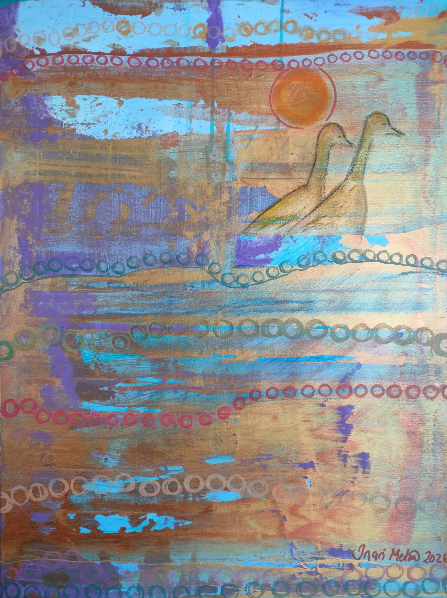 Reittiä pohdittu, suunta selvä II, 2026. Koko 80 x 60 cm. Sekatekniikka kankaalle. Rautalankaripustus, reunat maalatut.