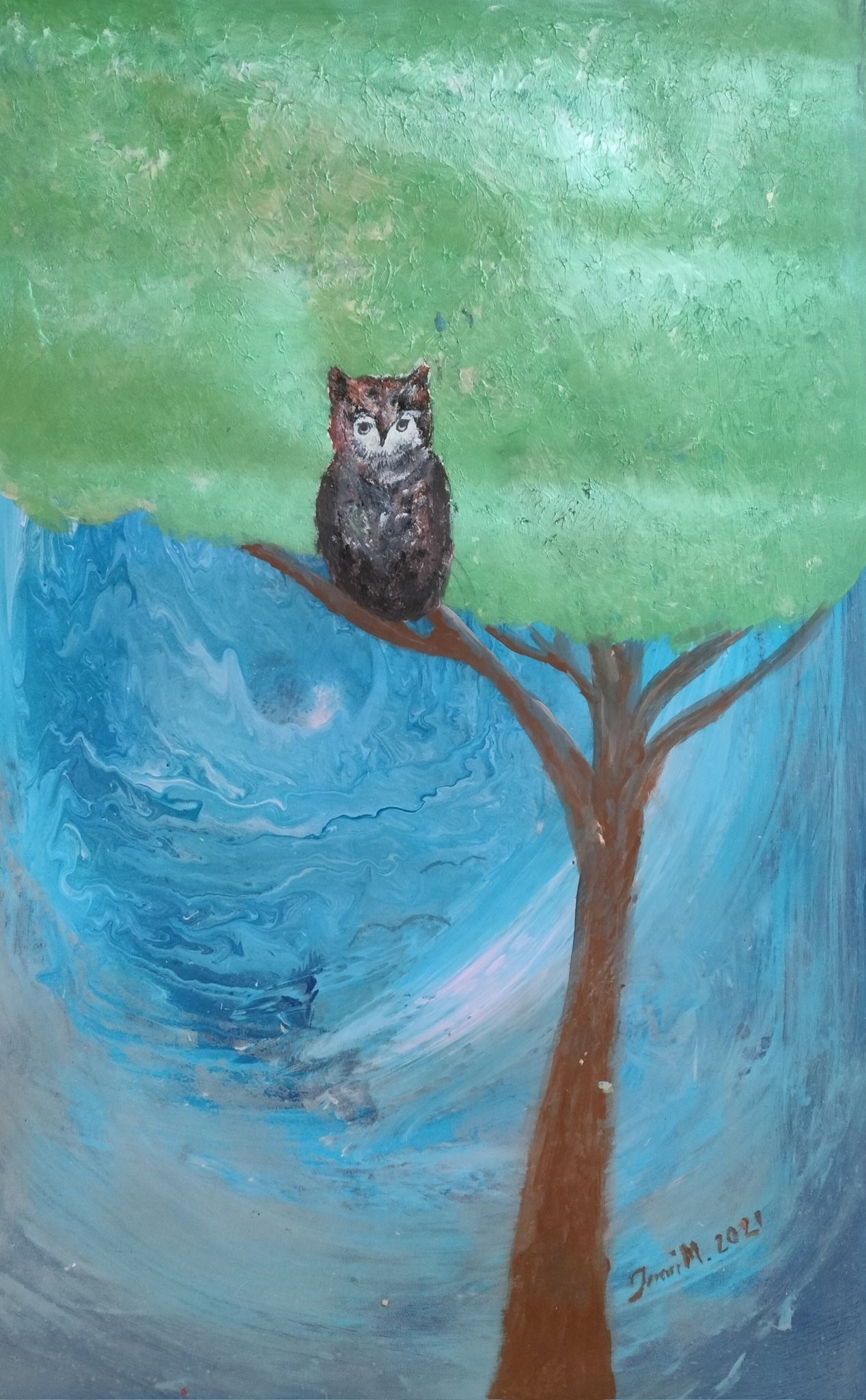 Yön valvoja, 2021. Akryylimaalaus kierrätettyyn canvaspohjaan. Ilman kehystä koko 54 x 35 cm, kuvassa on ehdotus kehykseksi. Teos on kuitenkin maalattu myös reunoilta, joten kehys ei ole välttämätön. Rautalankaripustus.