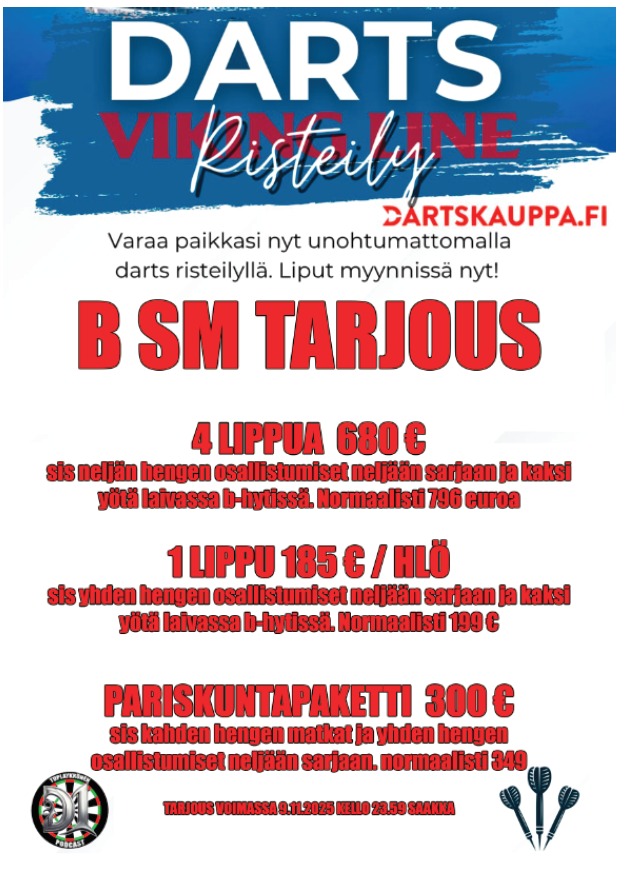 Hytti neljälle hengelle, kisaosallistumiset ja kaksi yötä laivalla, nyt B SM -tarjoushintaan sunnuntaille 9.11.2025 saakka. Normaali hinta 796 €, nyt vain 680 €!