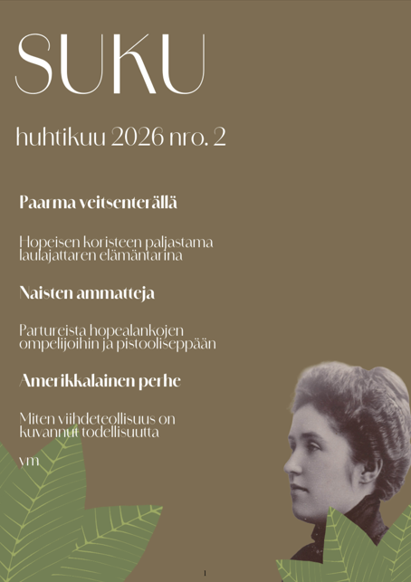 TIlaa tästä SUKU -lehden huhtikuun numero painettuna. Hinta sisältää postituksen Suomeen. Lehti lähtee tilaajille maaliskuun viimeisellä viikolla. Lehden artikkelit: Sisällysluettelo