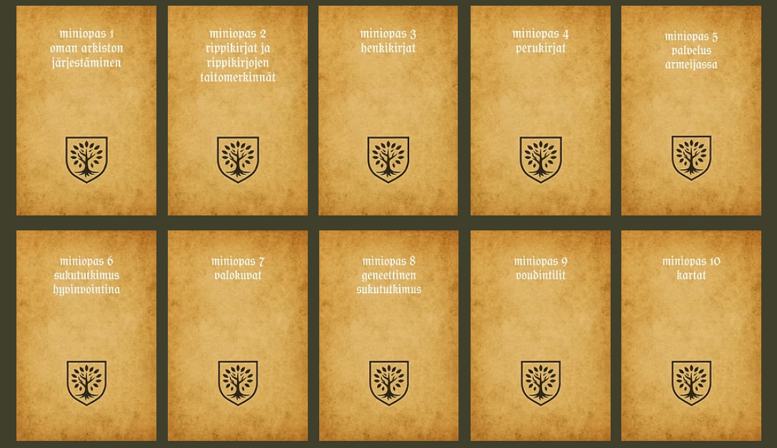 Kaikki 10 miniopasta samassa paketissa. Voit lukea niitä kätevästi suoraan ruudulta. Aiheet: oman arkiston järjestäminen rippikirjat henkikirjat perukirjat palvelus armeijassa sukututkimus hyvinvointina valokuvat geneettinen sukututkimus voudintilit kartat