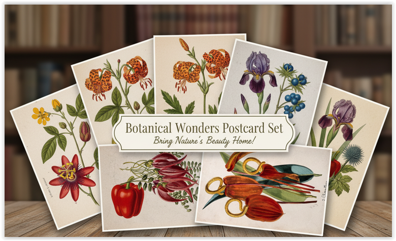 Pakkaus sisältää 10 erilaista korttia, a 2 kpl. Kuvina 1800 -luvun aitoja kukkateoksia, ei tekoälyllä tuotettua sisältöä.