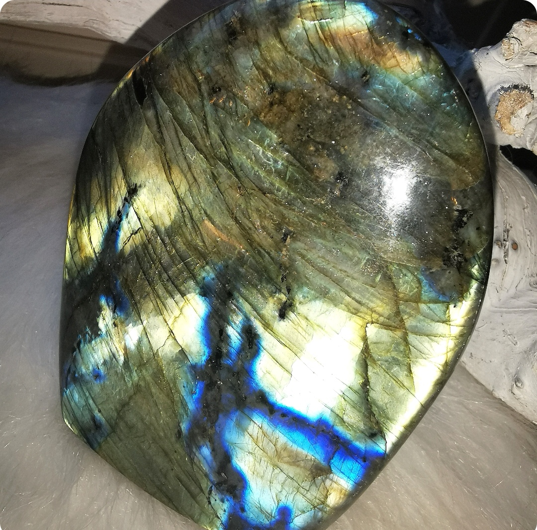 Upea hiottu labradoriitti kimpale, mielettömillä vihreän, sinisen ja keltaisen hohdoilla! Kiven koko 11.5cm x 10cm, paksuus noin 3cm.