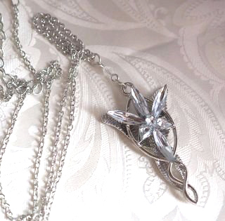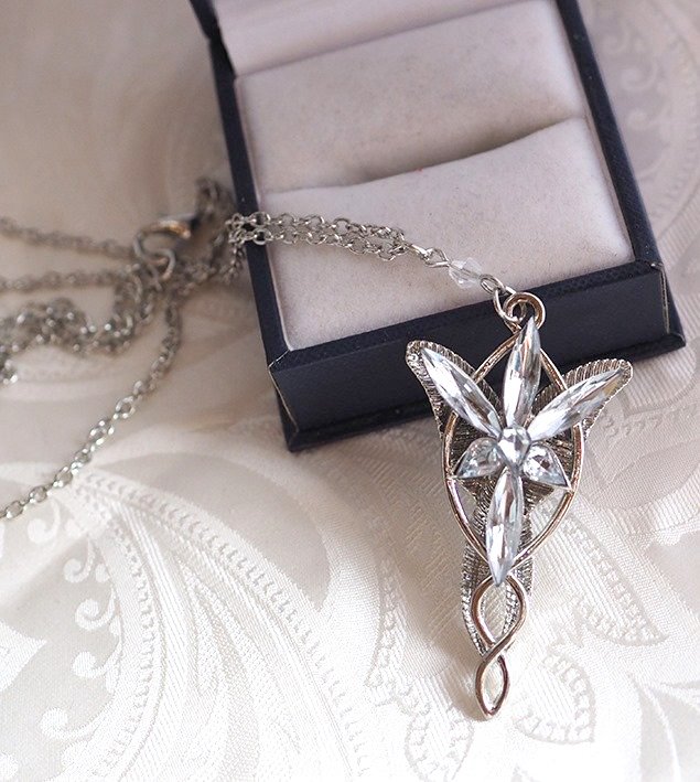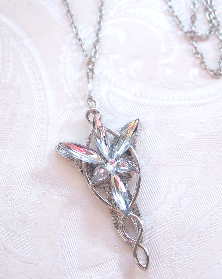 Arwenin iltatähtiriipus, kirkkaat kristallit, pituus 5 cm, cordell-ketjun pituus 50 cm, hopeoitu korumetalli. Tolkien tarun koru.