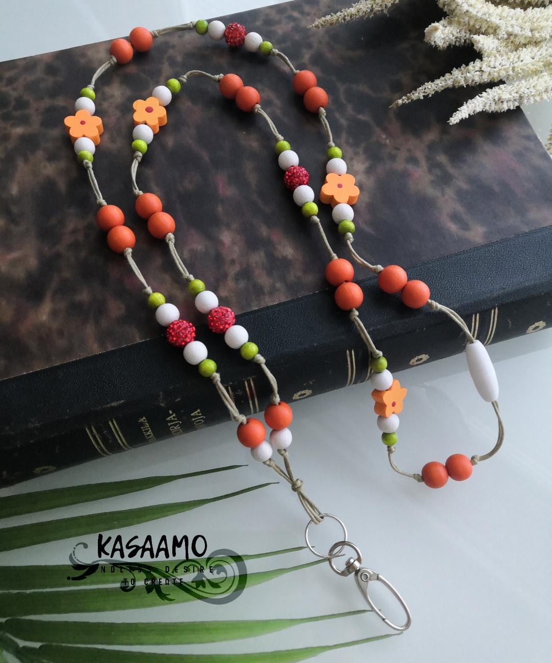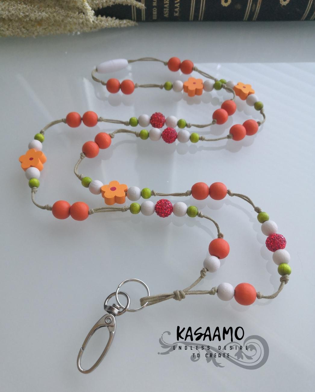 Oranssikukka koostuu oransseista (10mm), valkoisista (8mm) ja vihreistä (6mm) puuhelmistä sekä oransseista kukka-puuhelmistä (15mm) ja oransseista shamballa-helmistä (10mm), jotka on punottu kaksinkertaiseen puuvillanaruun (1mm). Niskassa on muovinen turvalukko, joka aukeaa nykäisystä. Rapulukko metallia. Avainnauha 1. pituus on 55cm, avattuna 96+7cm -hiekan sävyinen naru. (ovh. 19€)