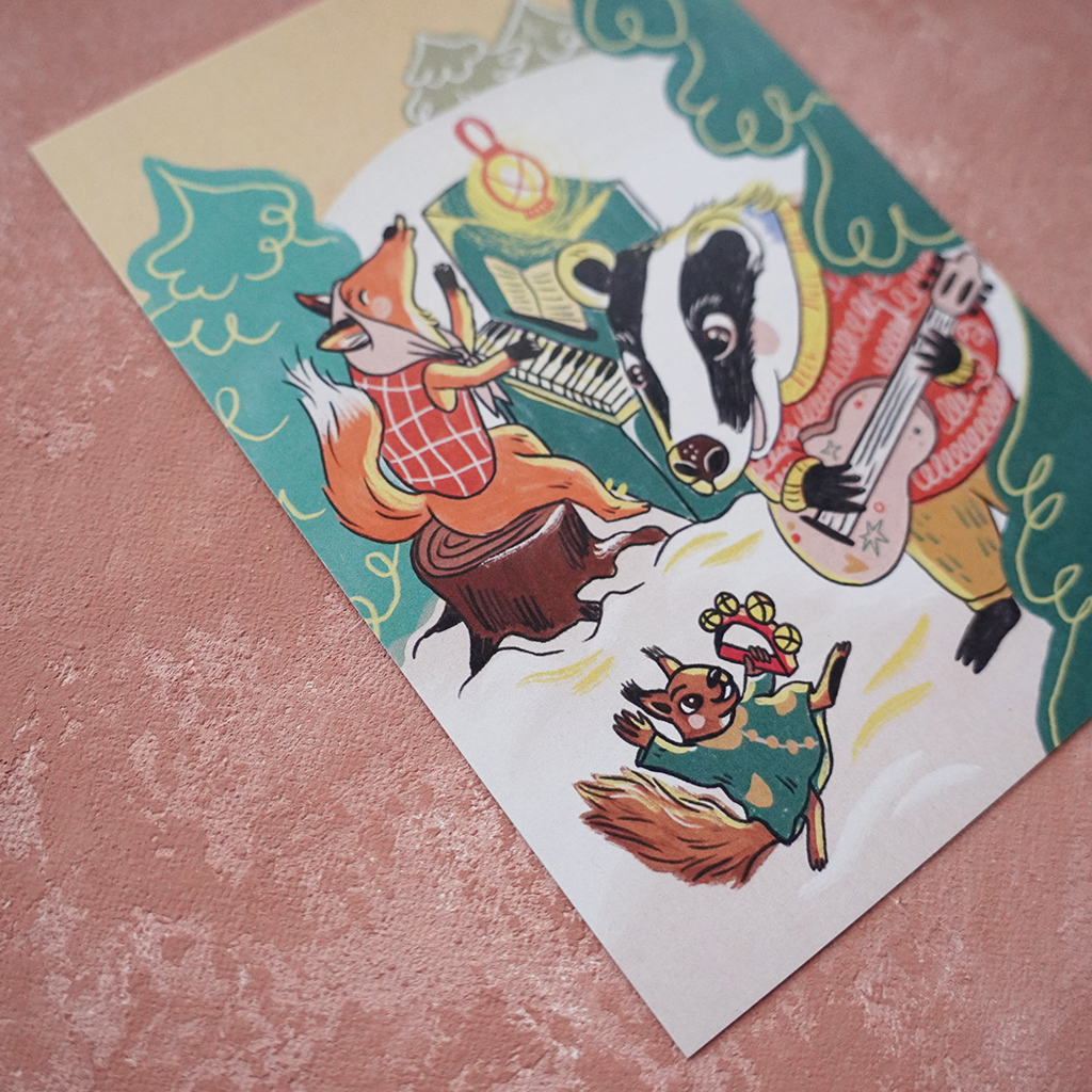 Iloinen metsäbändi laittanut keikan pystyyn ja svengaa hangella! Mitäköhän mäyrä, orava ja kettu soittavat?