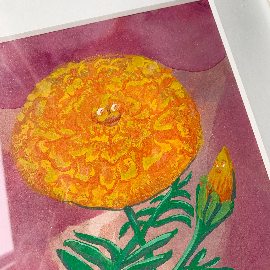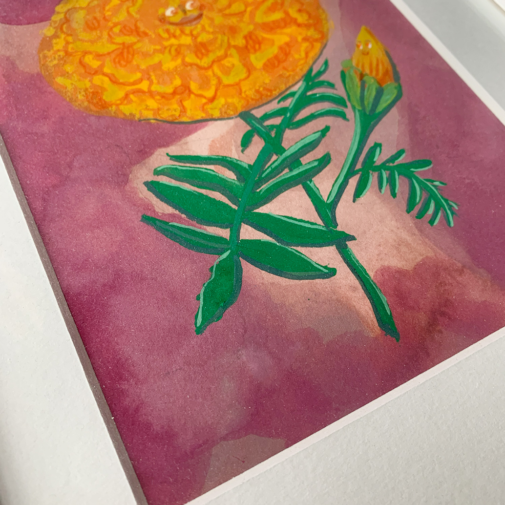 Samettiruusu ja nuppu -guassityö. Työ on tehty guasseilla ja puuväreillä. Kehystetty suomalaisella valkoisella puulla. Huom! Työ saatavilla vasta 20.12.2025 jälkeen, koska se menee näyttelyyn Kaapelitehtaalle 4.-20.12.2025.