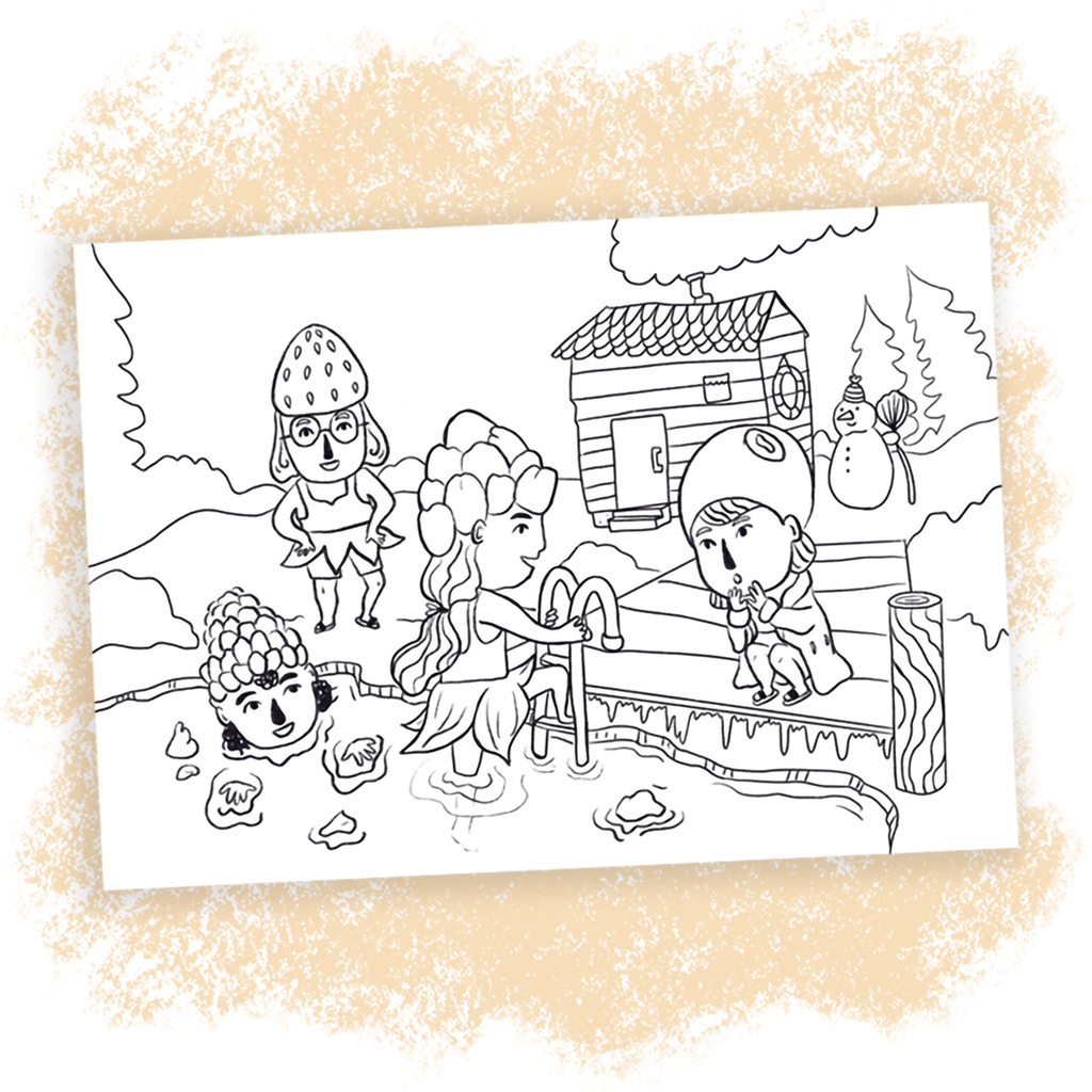 Hauska värityskuva marjalapsista avannossa! Ostoksen jälkeen kuva ladataan koneelle ja sen voi tulostaa värityspuuhiin.