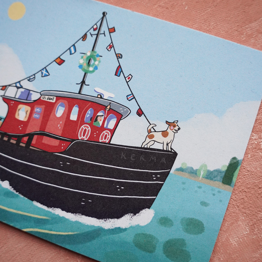 Laiva matkalla seikkailuun! Mukana kippari sekä kannella nautiskeleva koira.