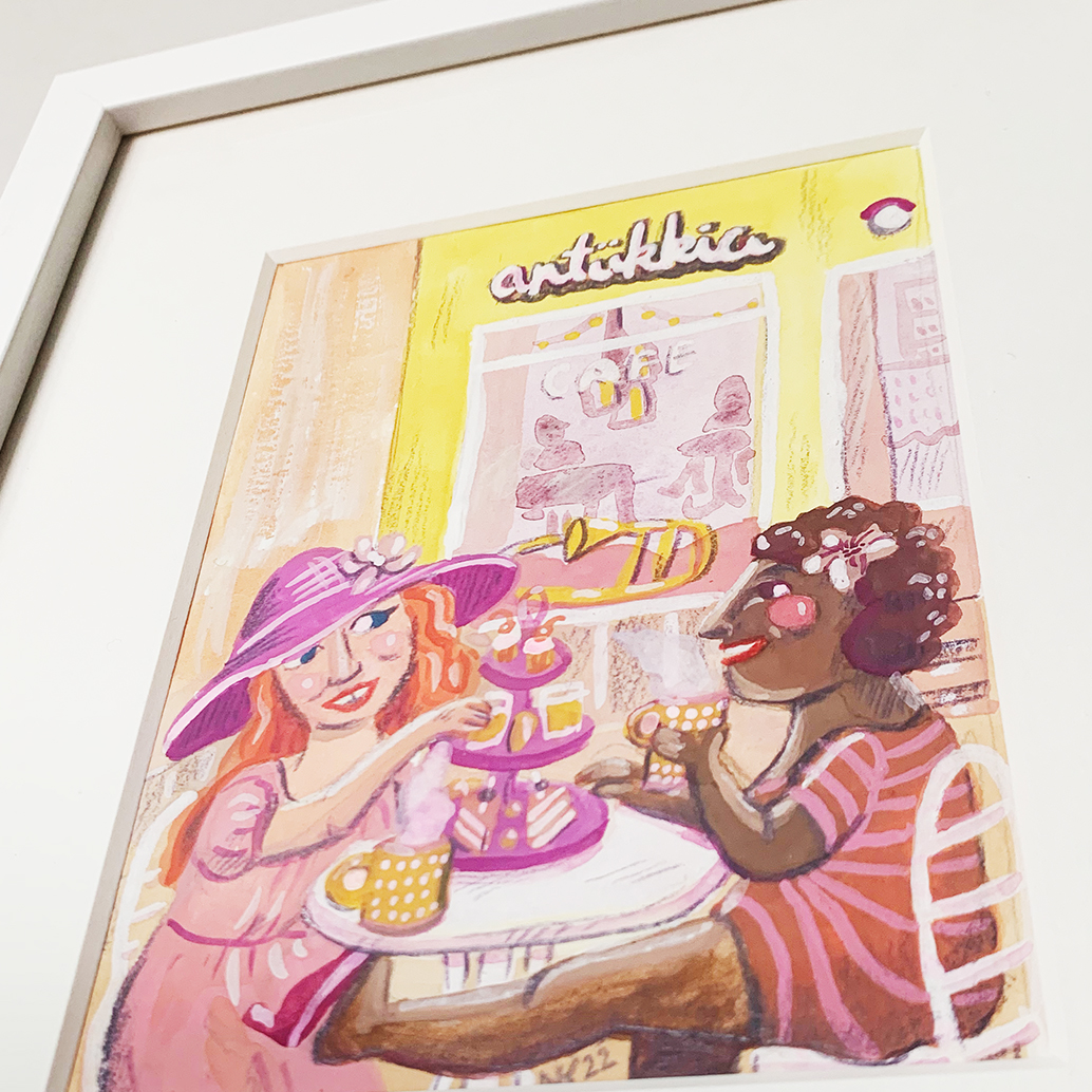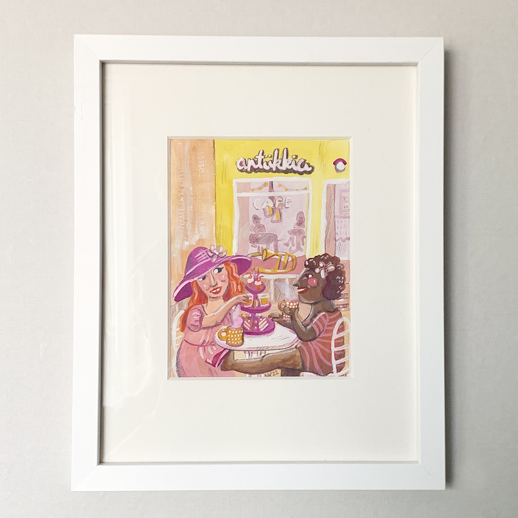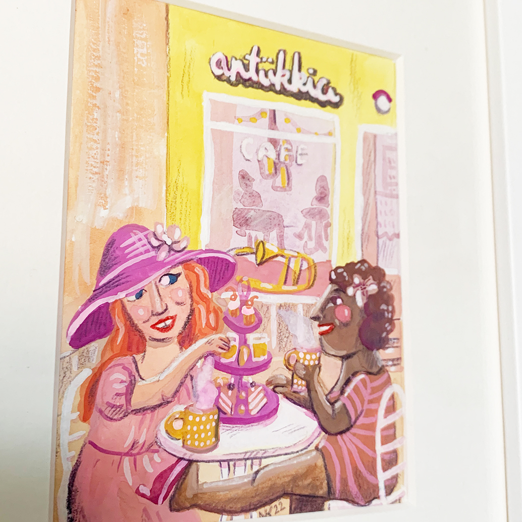 Iloiset kaverukset kahvilla. Inspiraationa työhön on ollut Helsingin Käpylän Saurahuone-kahvila. Työ on tehty guasseilla ja puuväreillä.