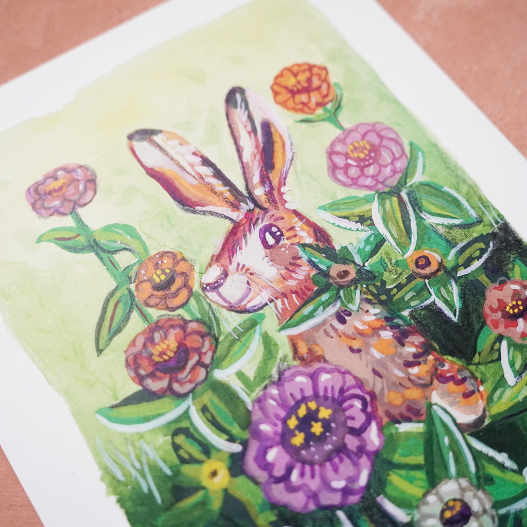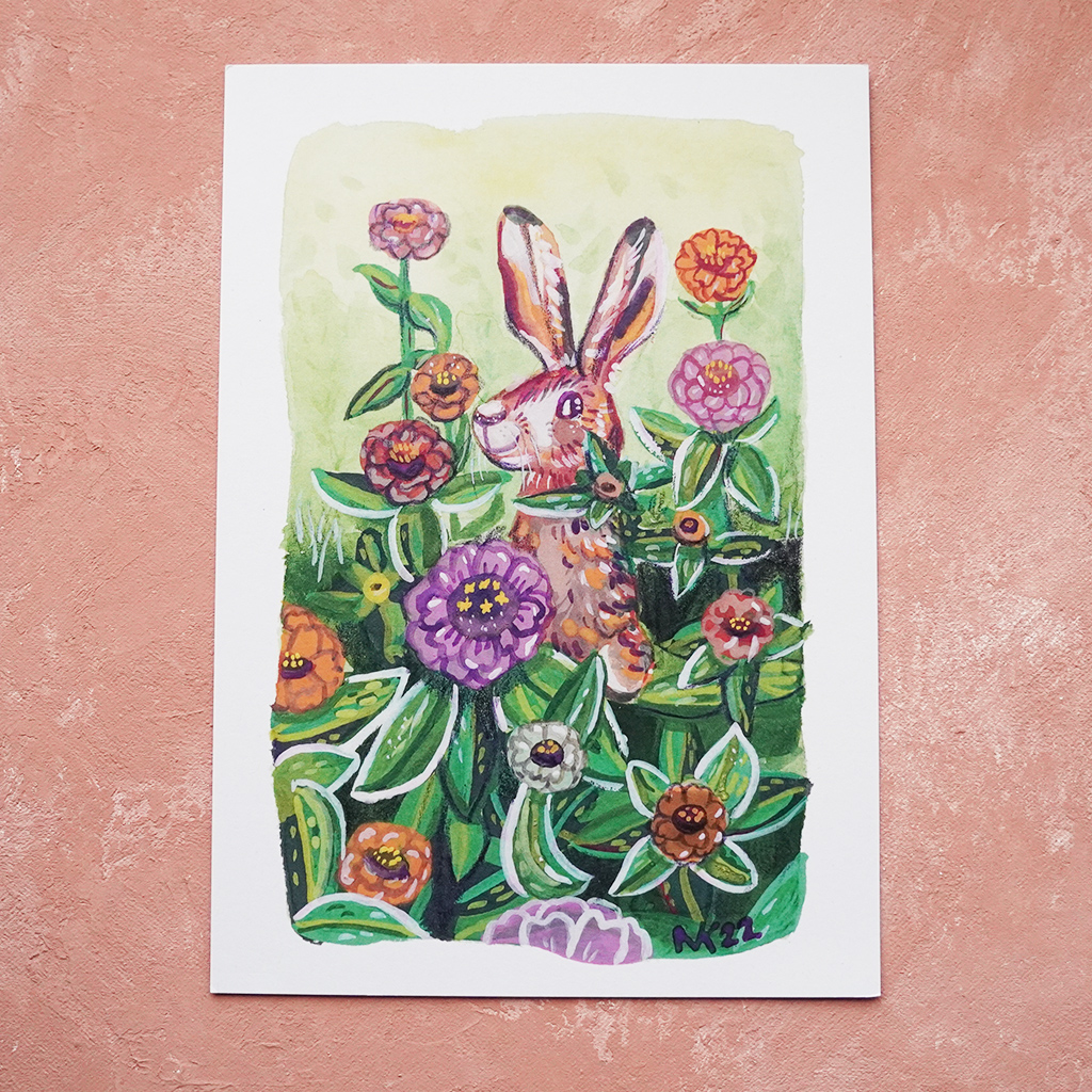 Muikea pupu hymyilee tsinniapensaan keskeltä - mitäköhän sillä on mielessä? Alkuperäinen työ on tehty guassimaaleilla.