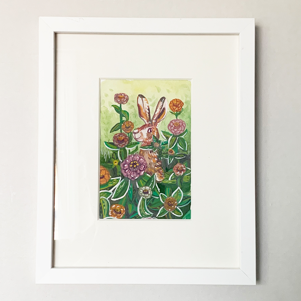 Jänis värikkäiden tsinniapensaiden keskellä. Työ on tehty guasseilla ja puuväreillä. Kehystetty valkoisilla Suomessa valmistetuilla kehyksillä.