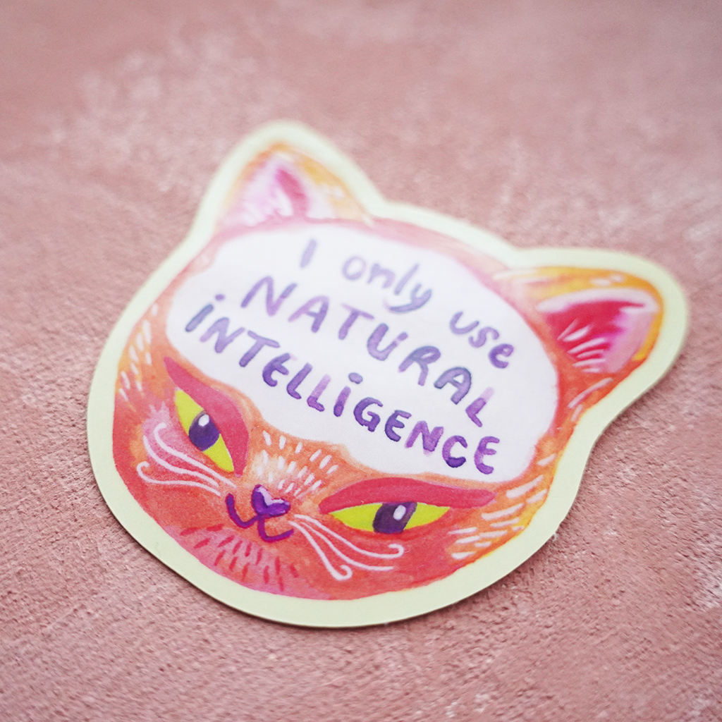Tää kissa onkin fiksu ja käyttää vain omaa älyään! Tarra on pieni tarrankokoinen vastaisku tekoälylle.