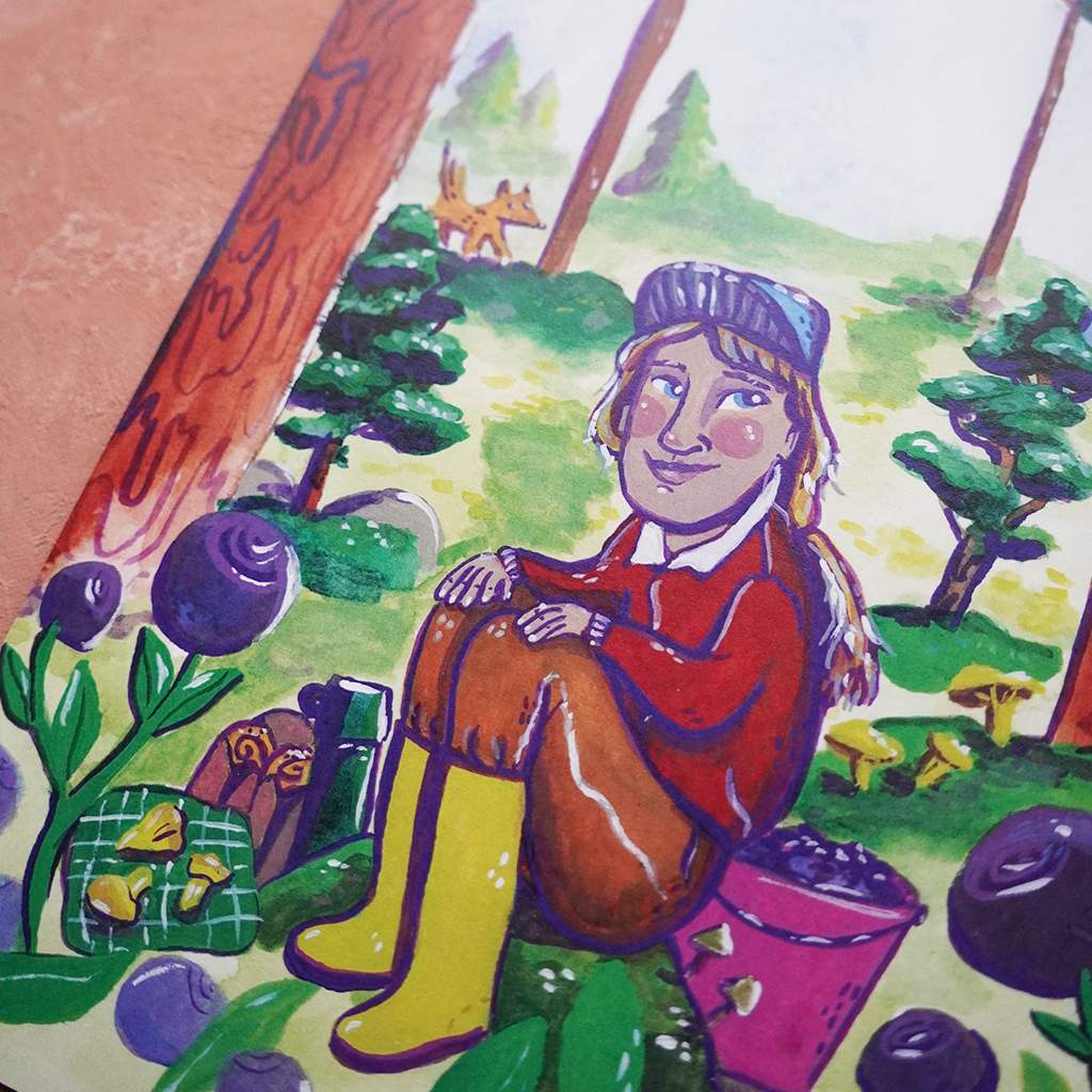 Karjalaisesta sananlaskusta "eläppä hättäile, istuppa mättäälle" inspiroitunut taideprintti. Mustikkametsässä ei kannata hätäillä, vaan voi ottaa rauhassa, katsoa ympäröivää luontoa ja sen kaikkia ihmeitä. Alkuperäinen työ on tehty guassimaaleilla.
