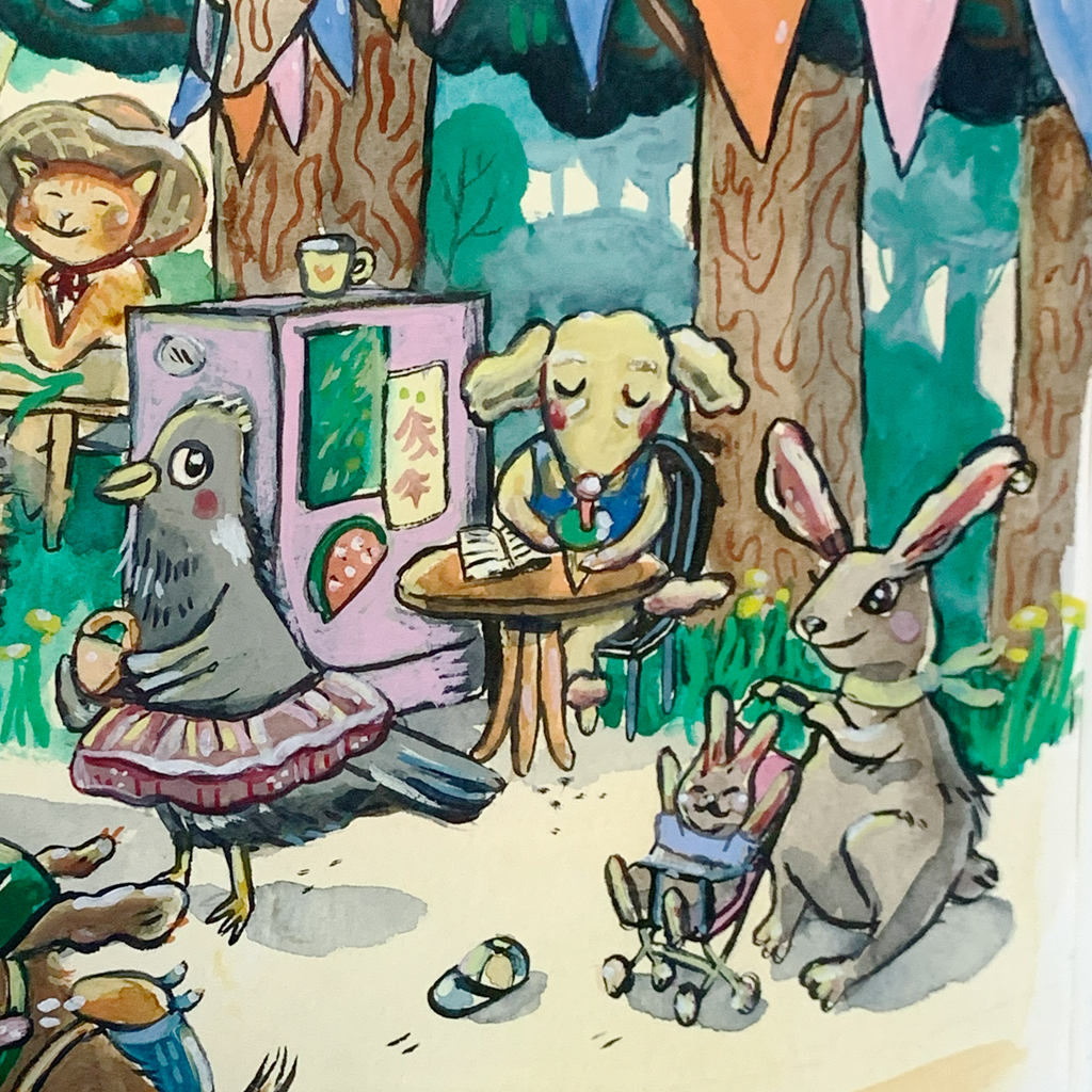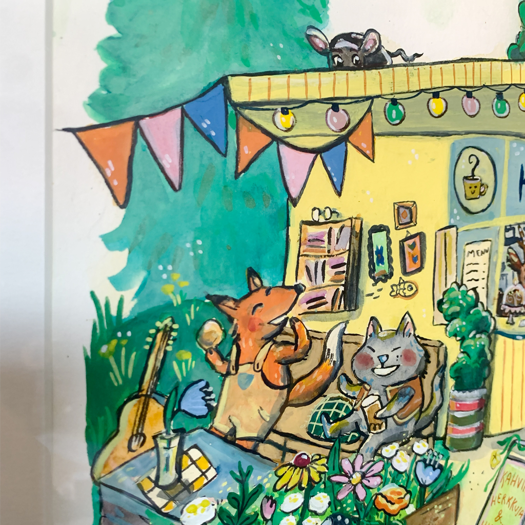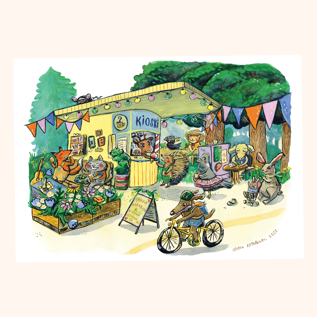 Vilinää täynnä olevasta työstä ei väriä puutu! Keltaisen kioskin ympärille on tullut iloinen joukko eläimiä viihtymään, juomaan kahvia ja nauttimaan kesäpäivästä.