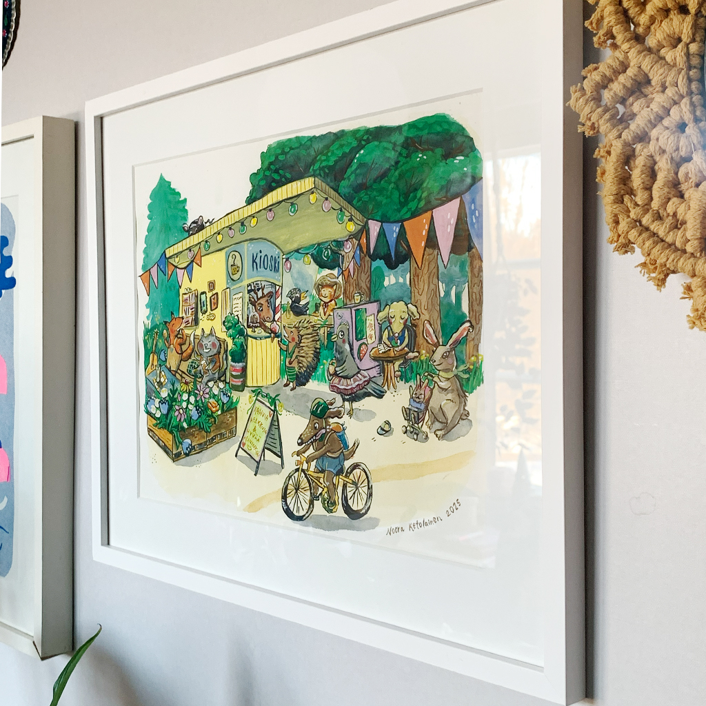 Koko: Työn koko 29,7 cm x 42 cm, kehyksen koko 40 x 50 cm. Myydään kehystettynä. Kehystetty käytetty suomalaista valkoiseksi maalattua puuta. Guassi, puuväri ja muste. 2024