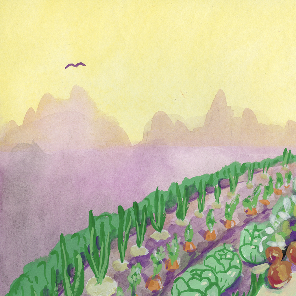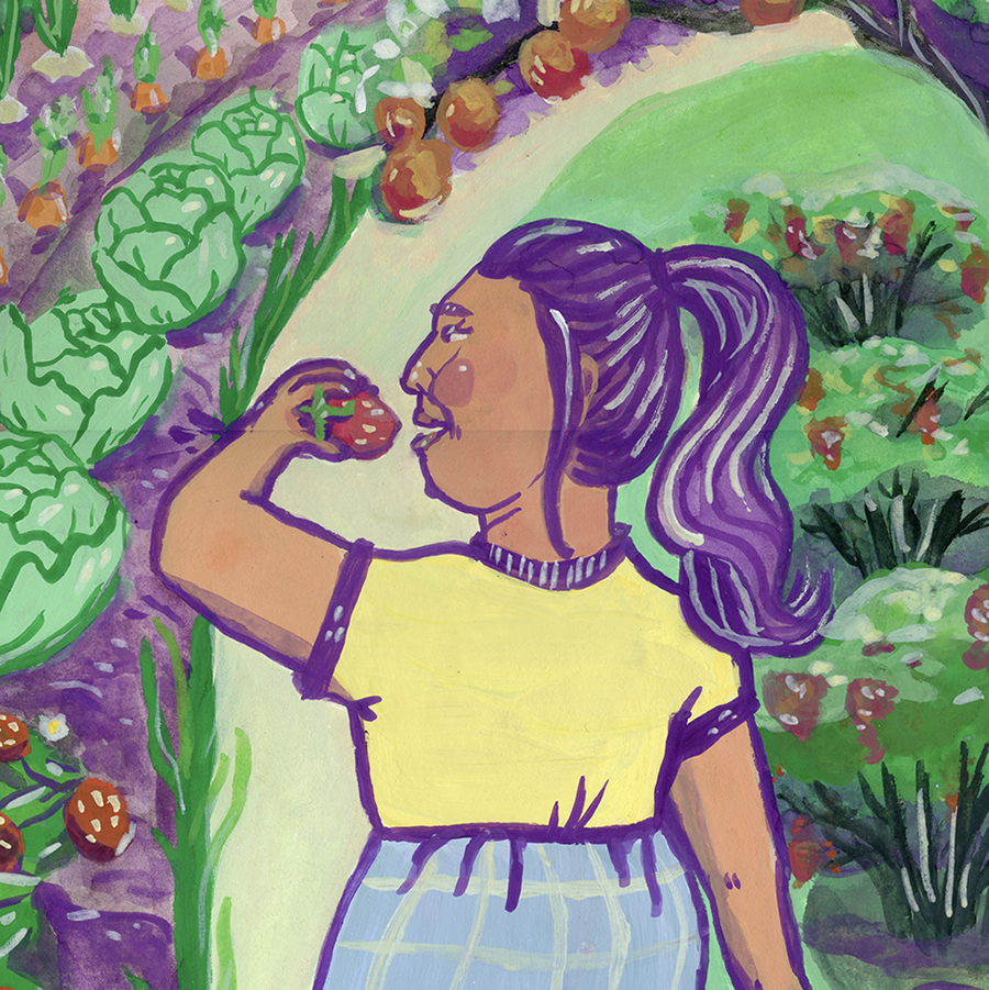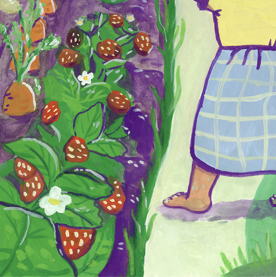 Maalauksessa on puutarhuri töissään nauttimassa tyytyväisenä kättensä tuloksesta. Työn nimi "sen suu napsaa kenen jalka kapsaa" on karjalainen sananlasku, joka viittaa uutteruuteen - kun teet paljon töitä, niin saat myös hyvin syödäksesi. Ja tässä puutarhassa nautittavaa onkin yllinkyllin! On mansikoita, kaaleja, porkkanoita, sipuleita, persikkapuu ja tsinnioita.