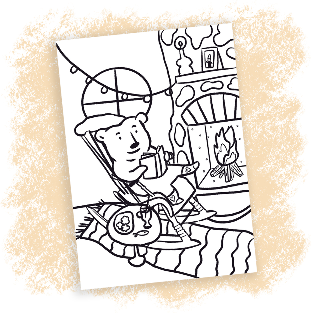 Iloinen värityskuva jääkarhusta lukemassa! Ostoksen jälkeen kuva ladataan koneelle ja sen voi tulostaa värityspuuhiin.