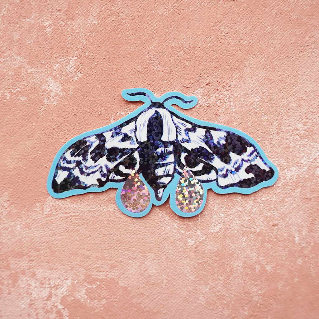 Sinisilmäkiitäjä -vinyylitarrassa kyyneleet kimaltelevat holografisella efektillä. Alkuperäinen työ on tehty sinisellä musteella.